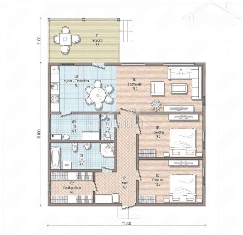 Вы можете заказать проект одноэтажного дома с террасой или без нее, который будет построен с учетом всех требований строительной безопасности. При разработке проекта специалисты ответственно предусмотрели все нюансы и гарантируют, что постройка, выполненные по подготовленному плану, будет не только долговечной и комфортной, но также порадует отличной шумоизоляцией, теплоизоляцией и массой других преимуществ.
