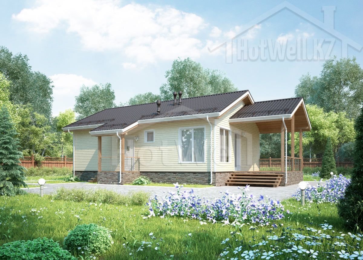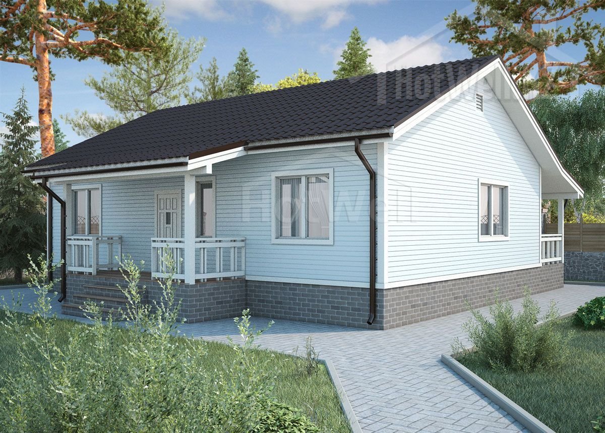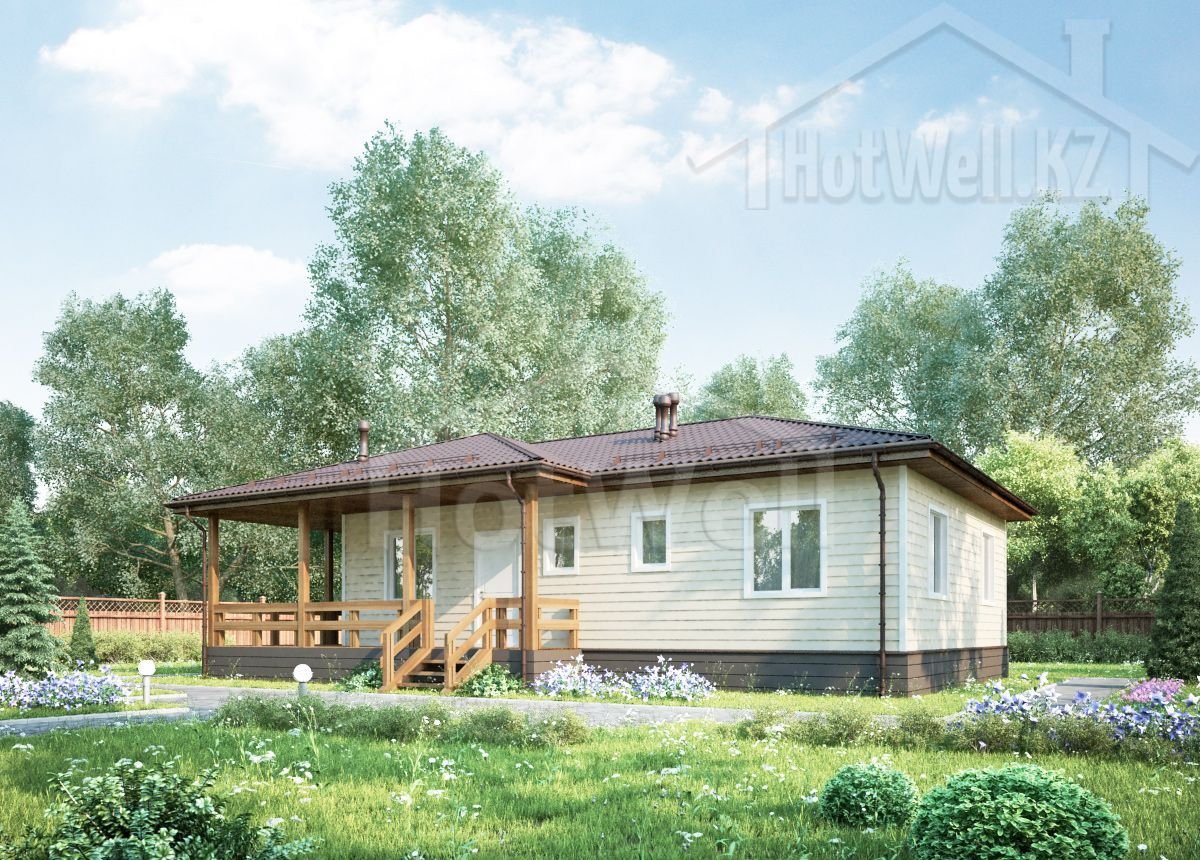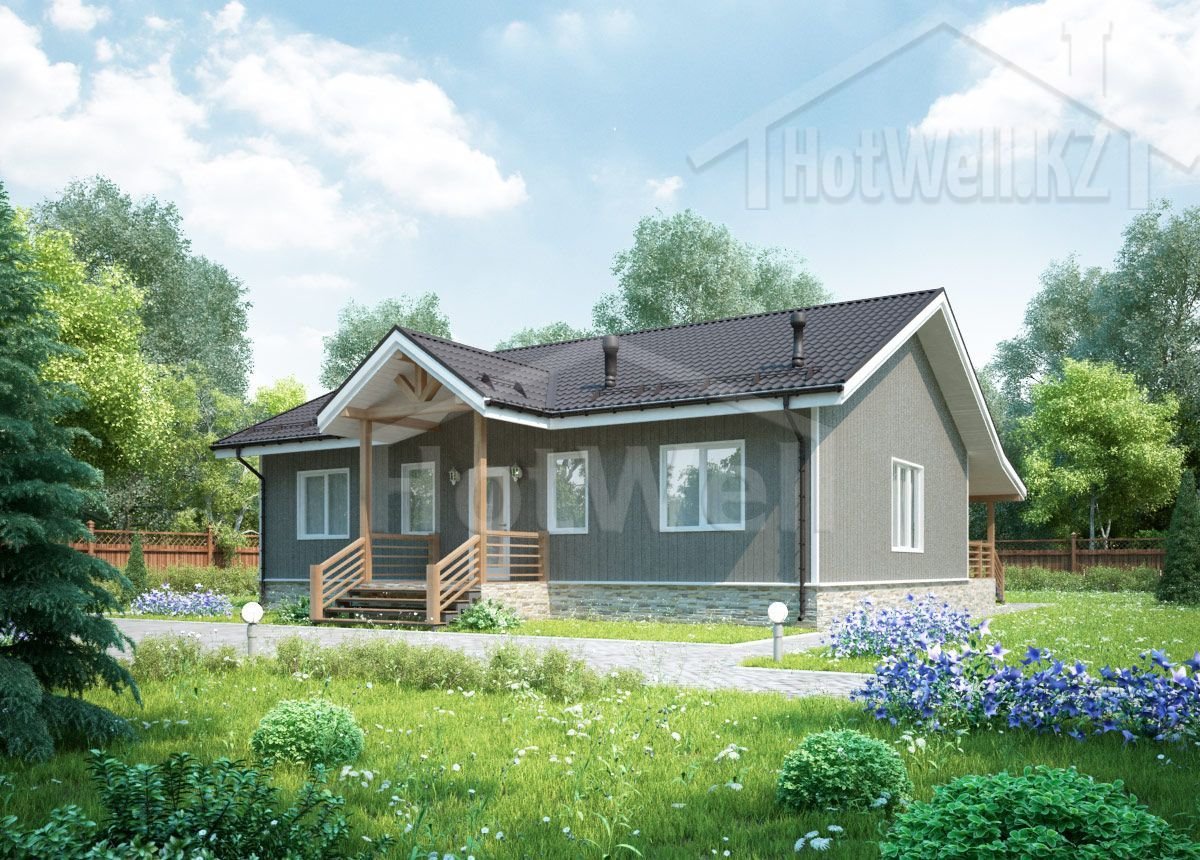 Одноэтажный дом 12 на 8 метров, общей площадью 104 м2, из СИП панелей, со спальней на первом этаже.