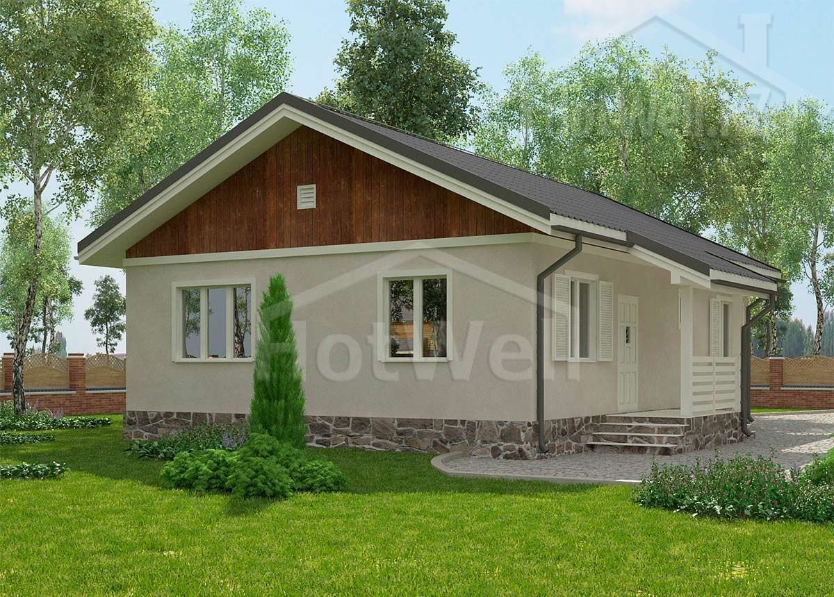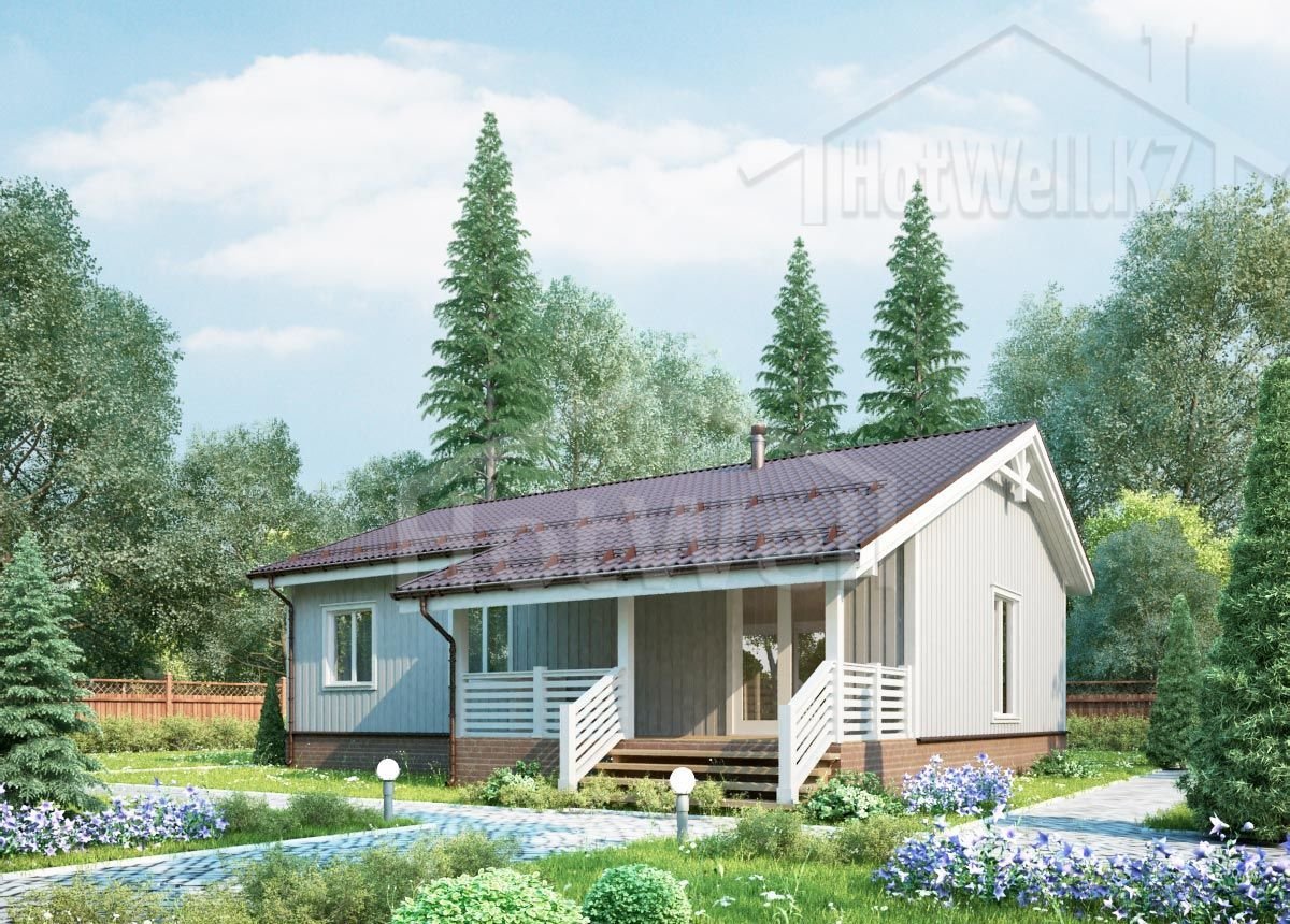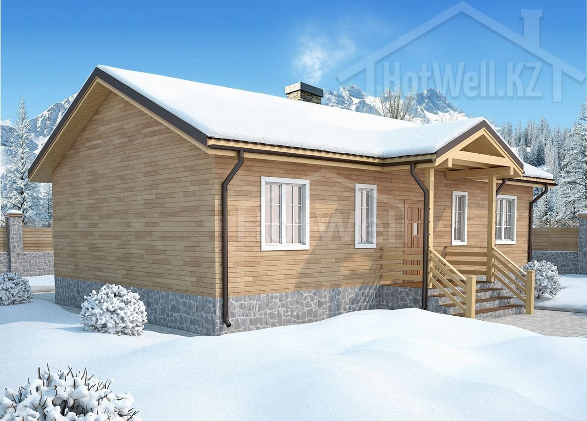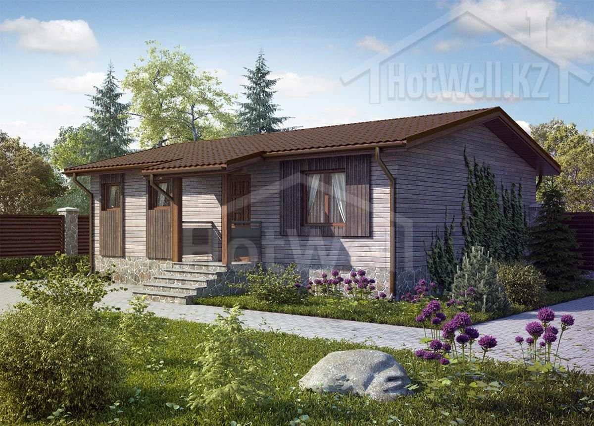 Одноэтажный дом 12 на 8 метров, общей площадью 104 м2, из СИП панелей, со спальней на первом этаже.