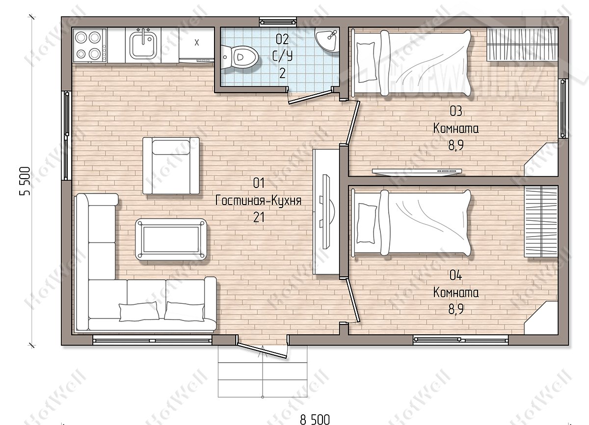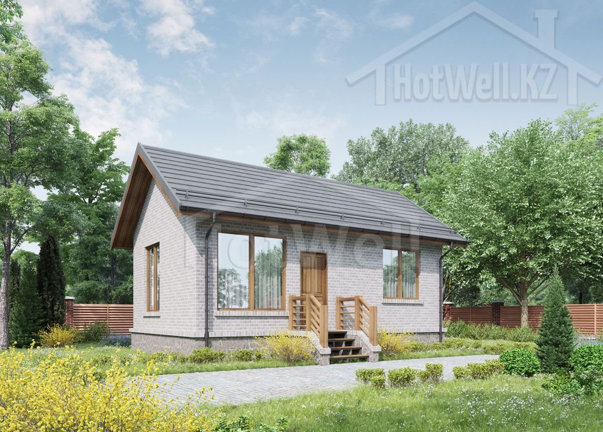 Одноэтажный дом 8 на 6 метров, общей площадью 47 м2, из СИП панелей, со спальней на первом этаже.