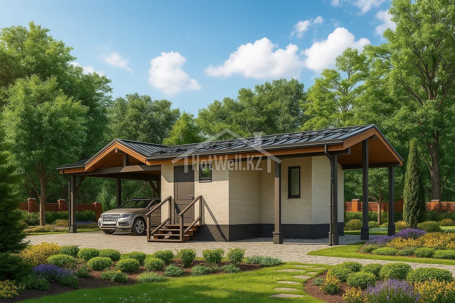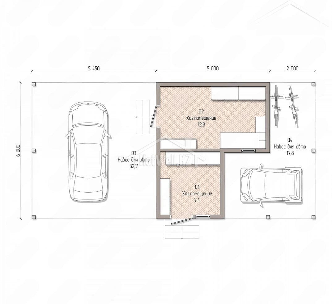Одноэтажный хозблок 13 на 6 метров, общей площадью 75 м2, из СИП панелей, с навесом