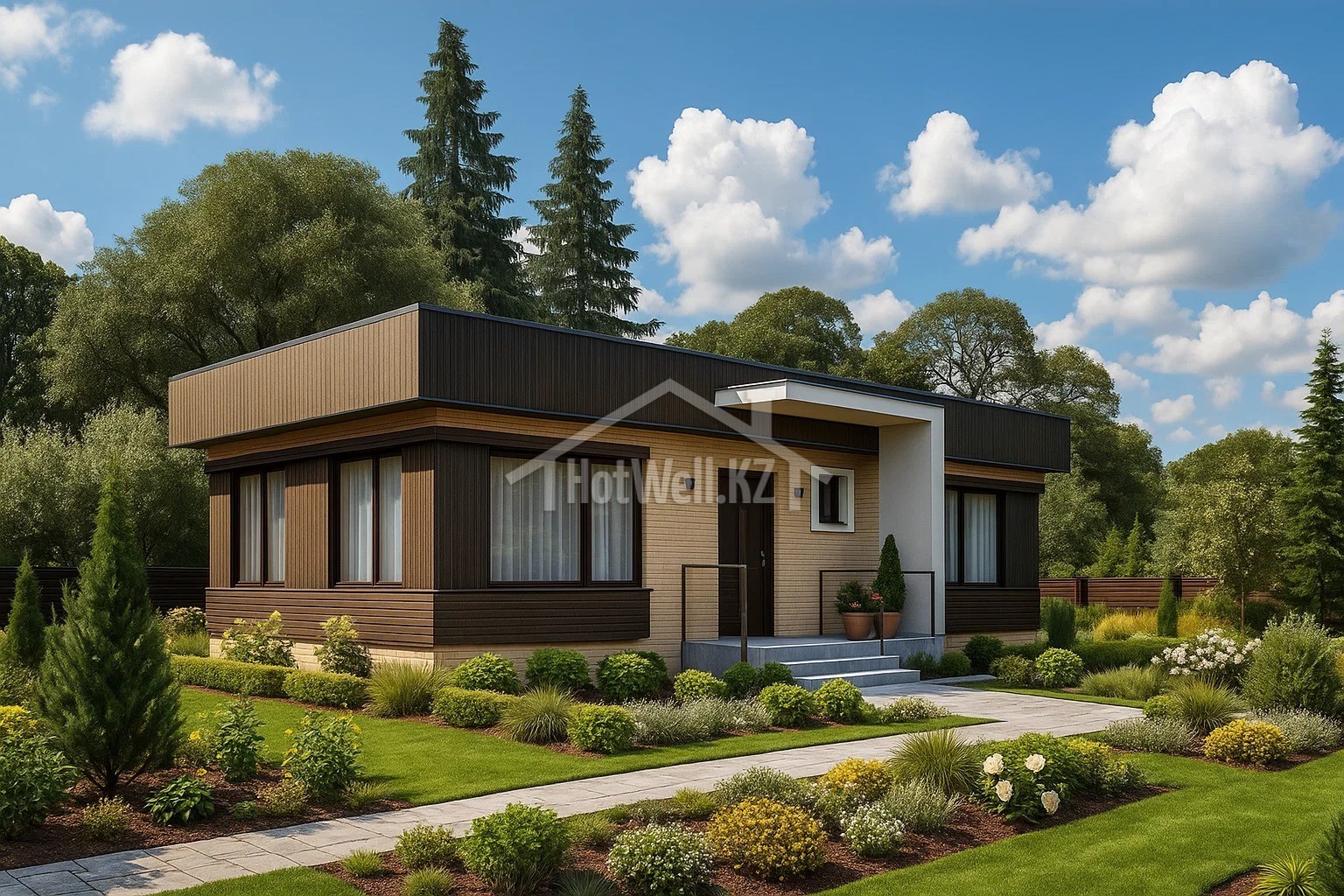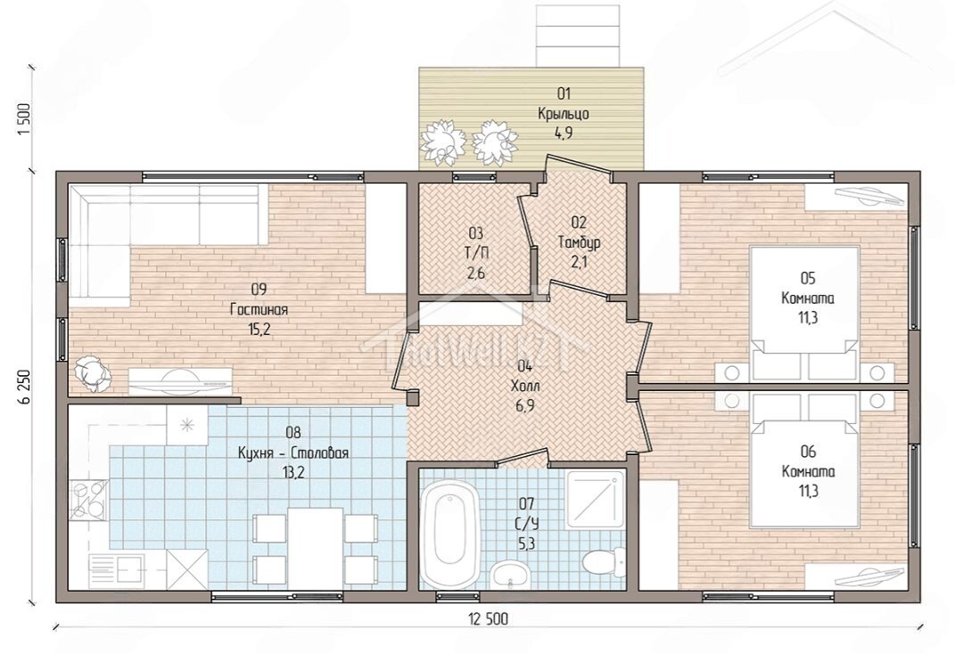Одноэтажный дом 13 на 8 метров, общей площадью 83 м2, из СИП панелей, с бойлерной и спальней на первом этаже
