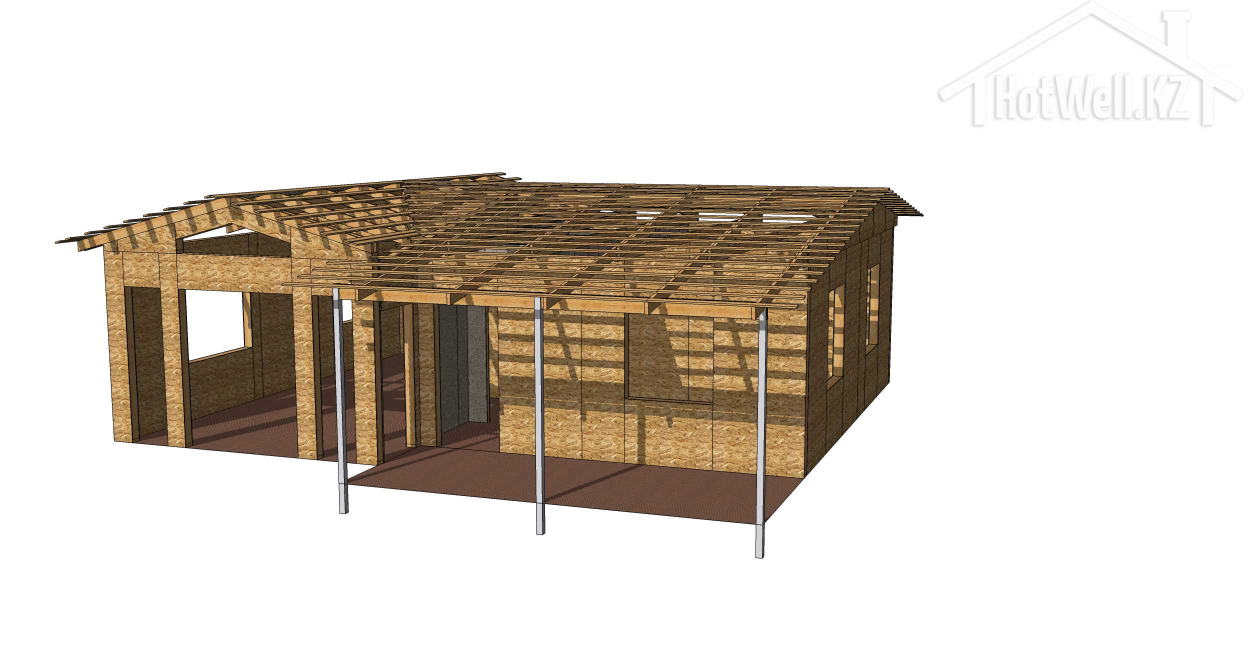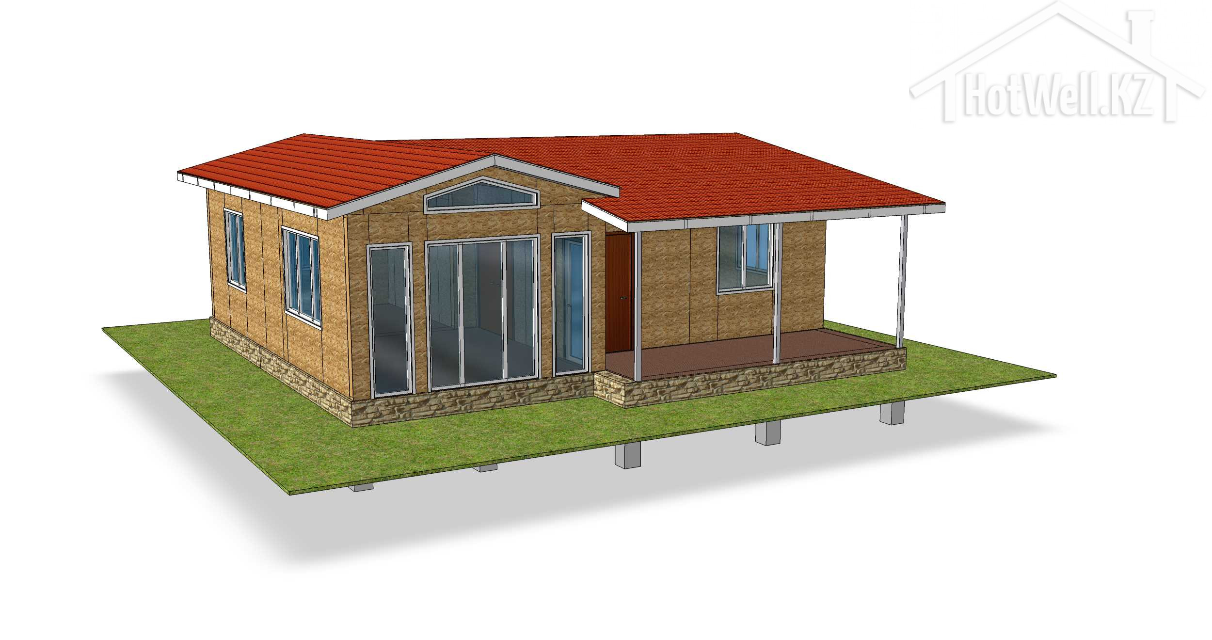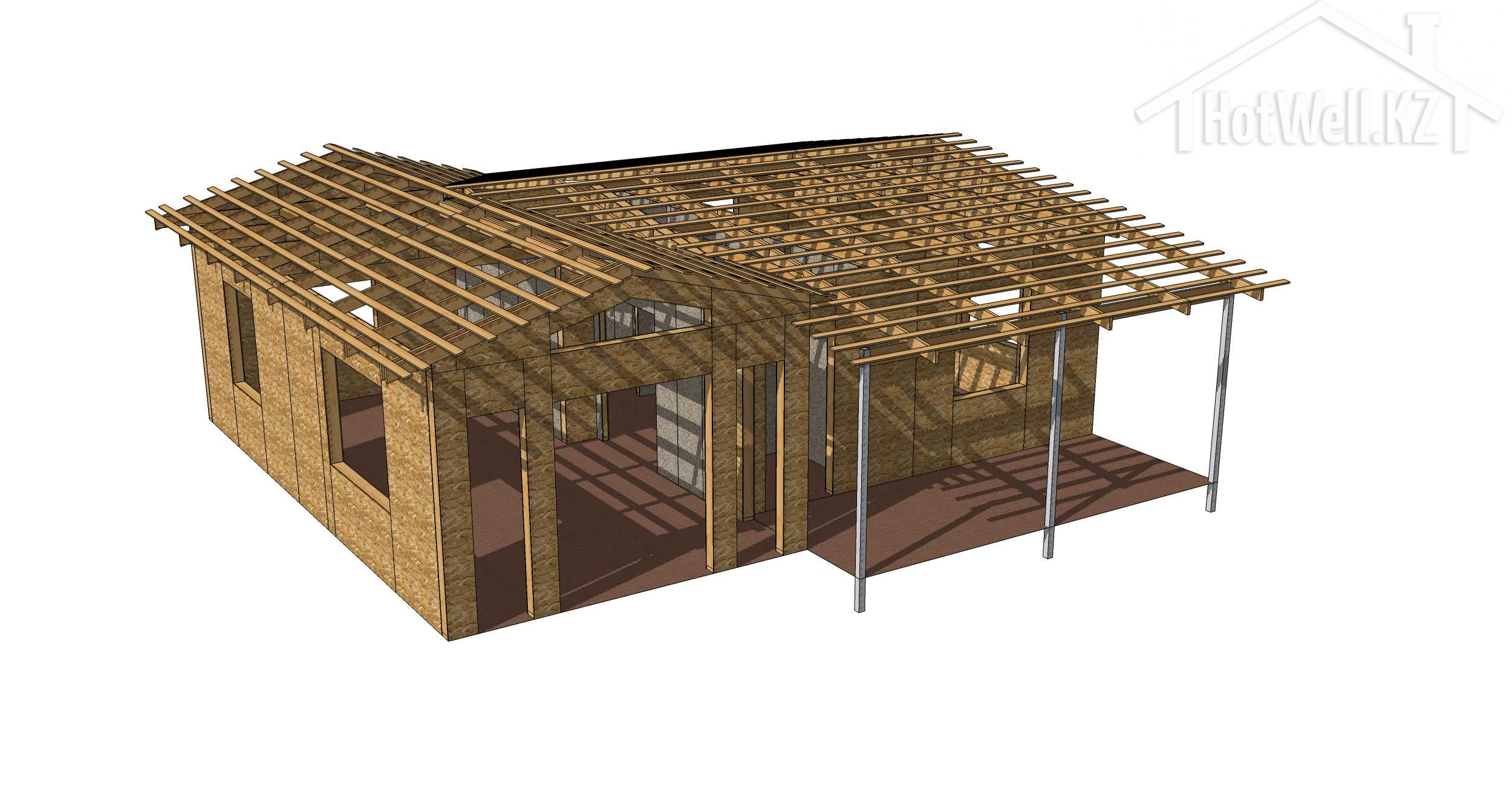 В комплект дома входит: Наружные стены из СИП панелей, инструкция (проект) для самостоятельной сборки, стропильная система крыши, обрешетка, межкомнатные перегородки + ГКЛ, шурупы, крепежные элементы. Фундамент заказчик заливает самостоятельно согластно проекта фундамента предоставленного от HotWell.KZ.