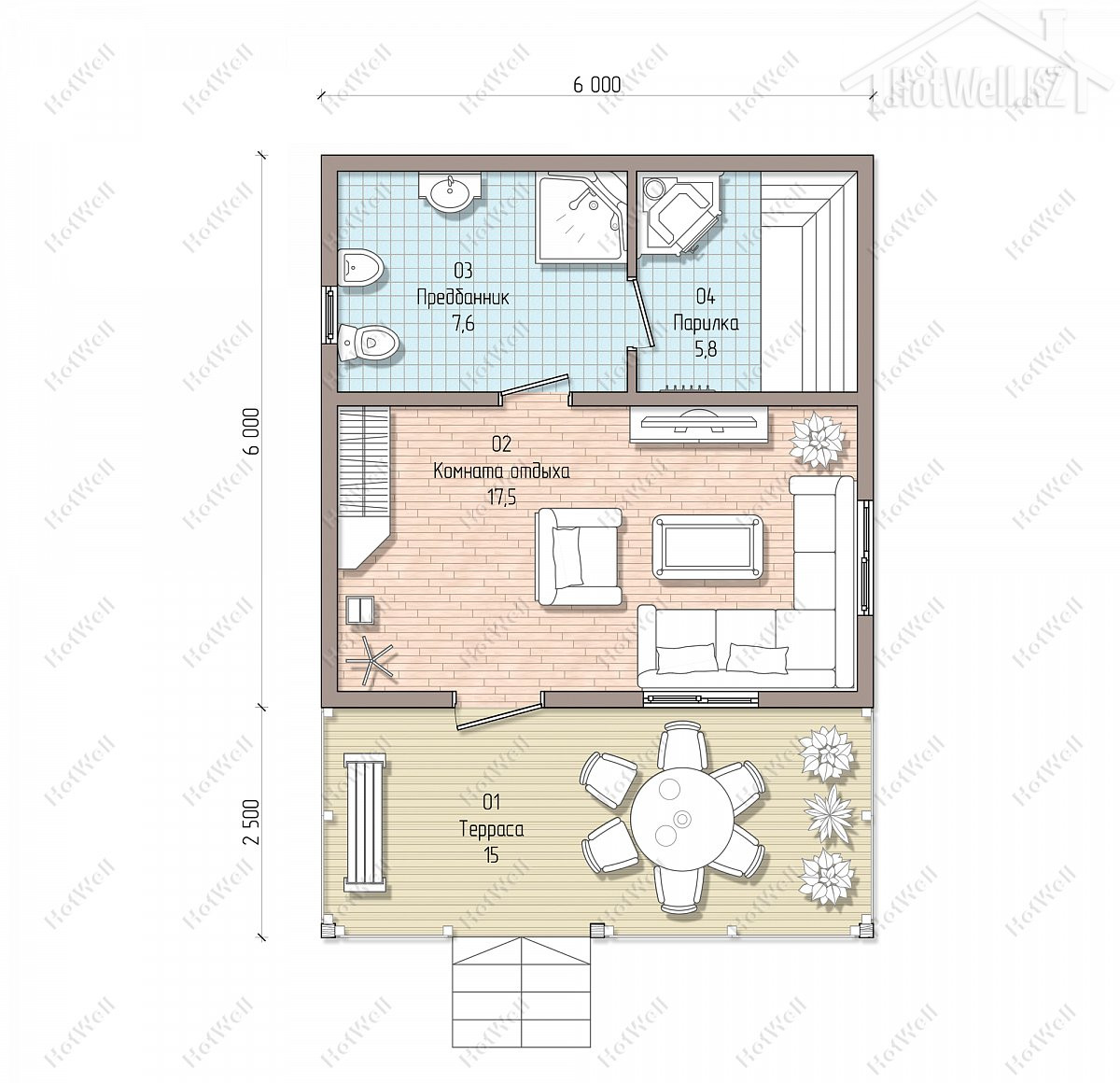 Одноэтажная баня 9 на 6 метров, общей площадью 51 м2, из СИП панелей, с сауной и террасой.