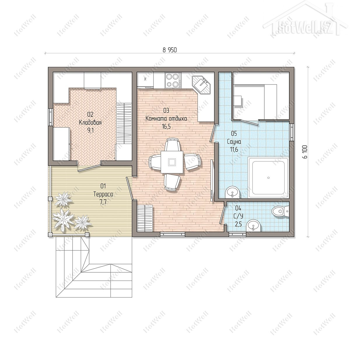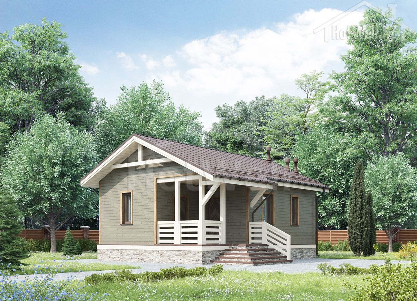 Одноэтажная баня общей площадью 54 м2, из СИП панелей, с сауной и террасой.