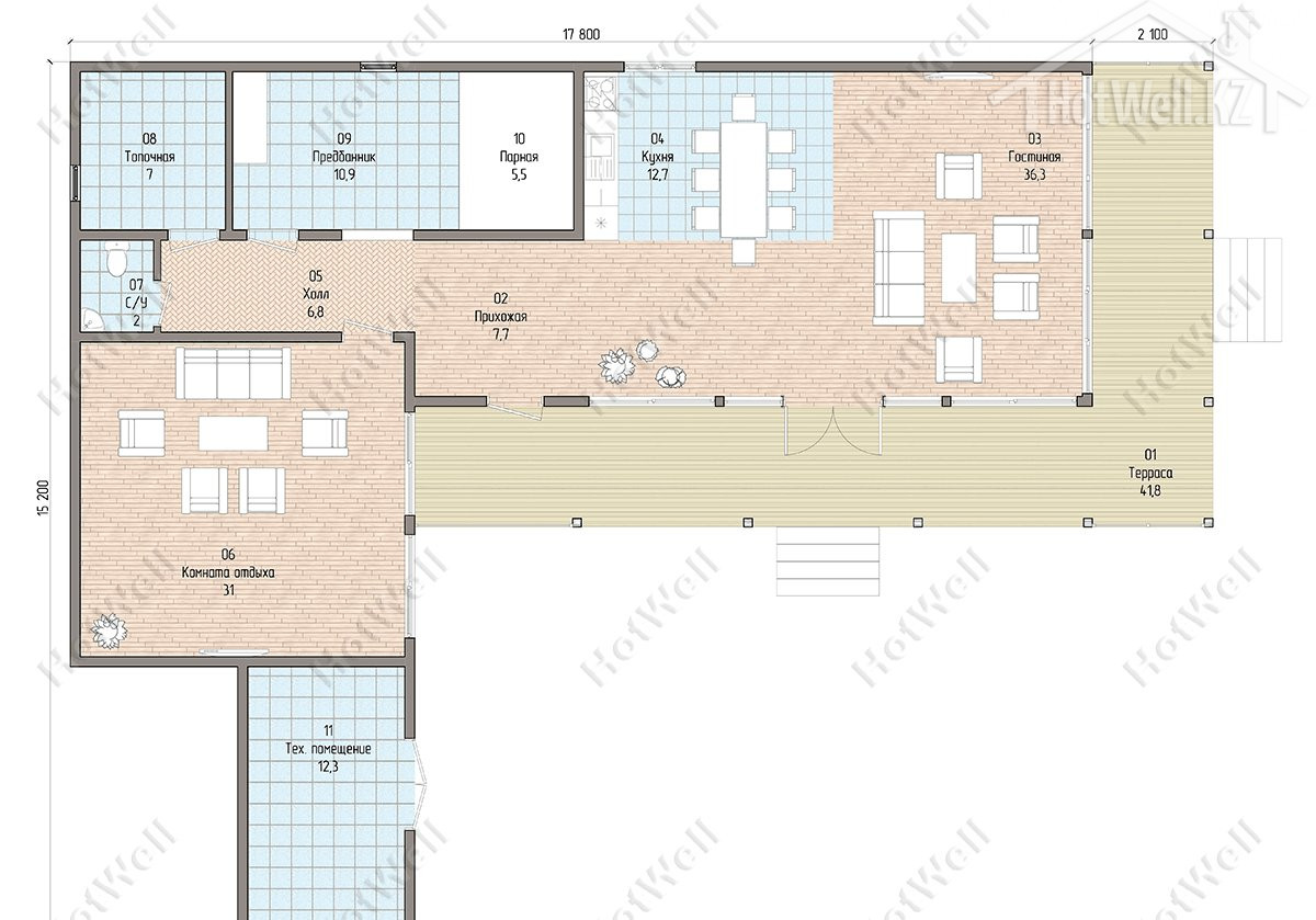Одноэтажная баня 20 на 15 метров, общей площадью 190 м2, из СИП панелей, с сауной, бойлерной, террасой и спальней на первом этаже.
