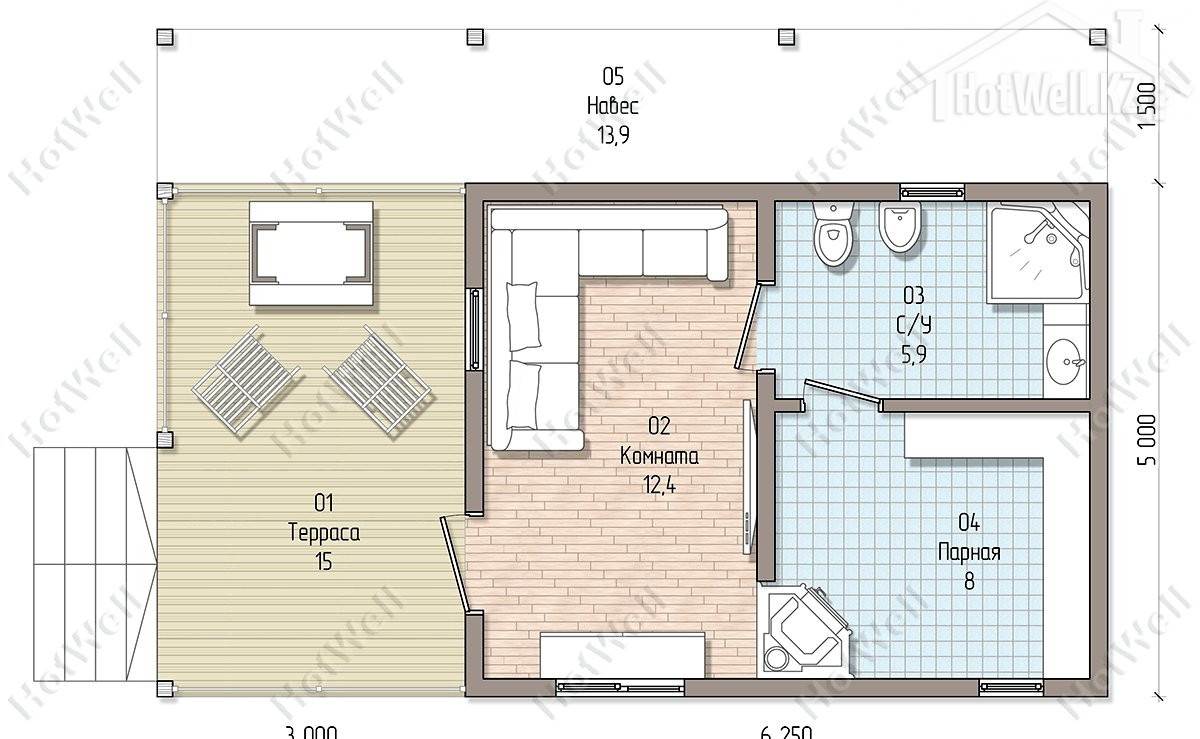 Одноэтажная баня 9 на 7 метров, общей площадью 60 м2, из СИП панелей, с террасой.