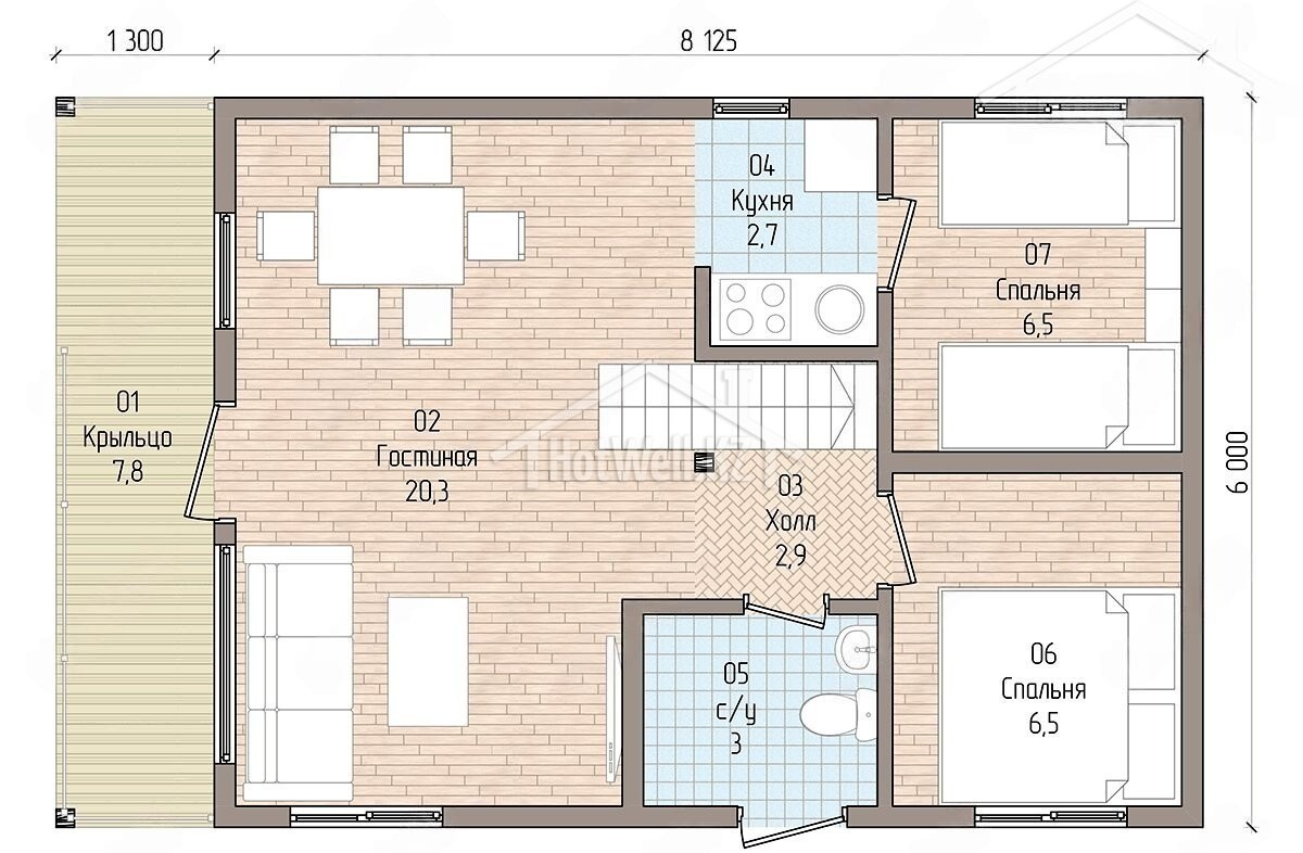 Дом с мансардой 9 на 6 метров, общей площадью 105 м2, из СИП панелей, с террасой, вторым светом и спальней на первом этаже.