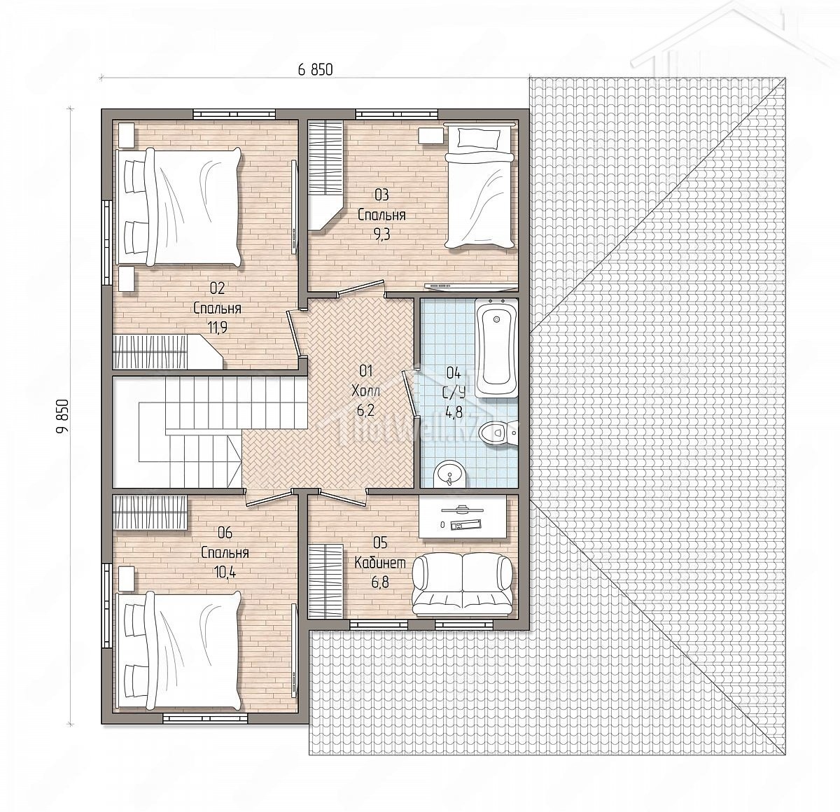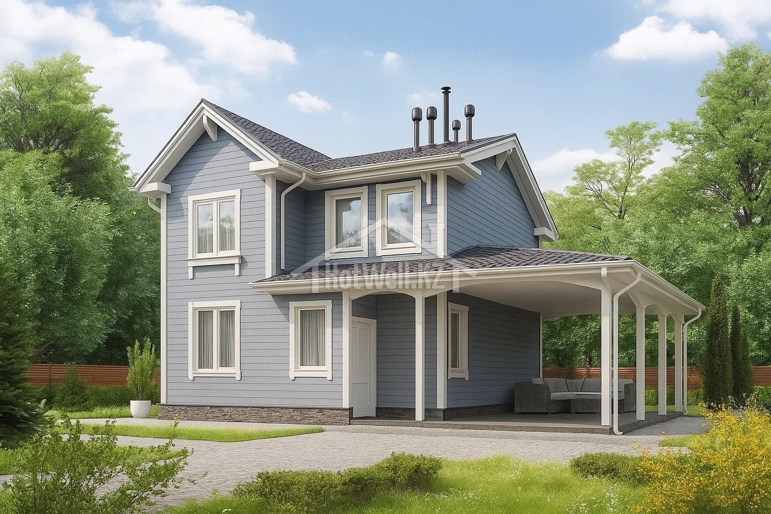Двухэтажный дом 10 на 10 метров, общей площадью 164 м2, из СИП панелей, с бойлерной, навесом и спальней на первом этаже.