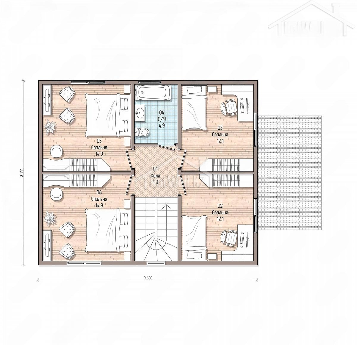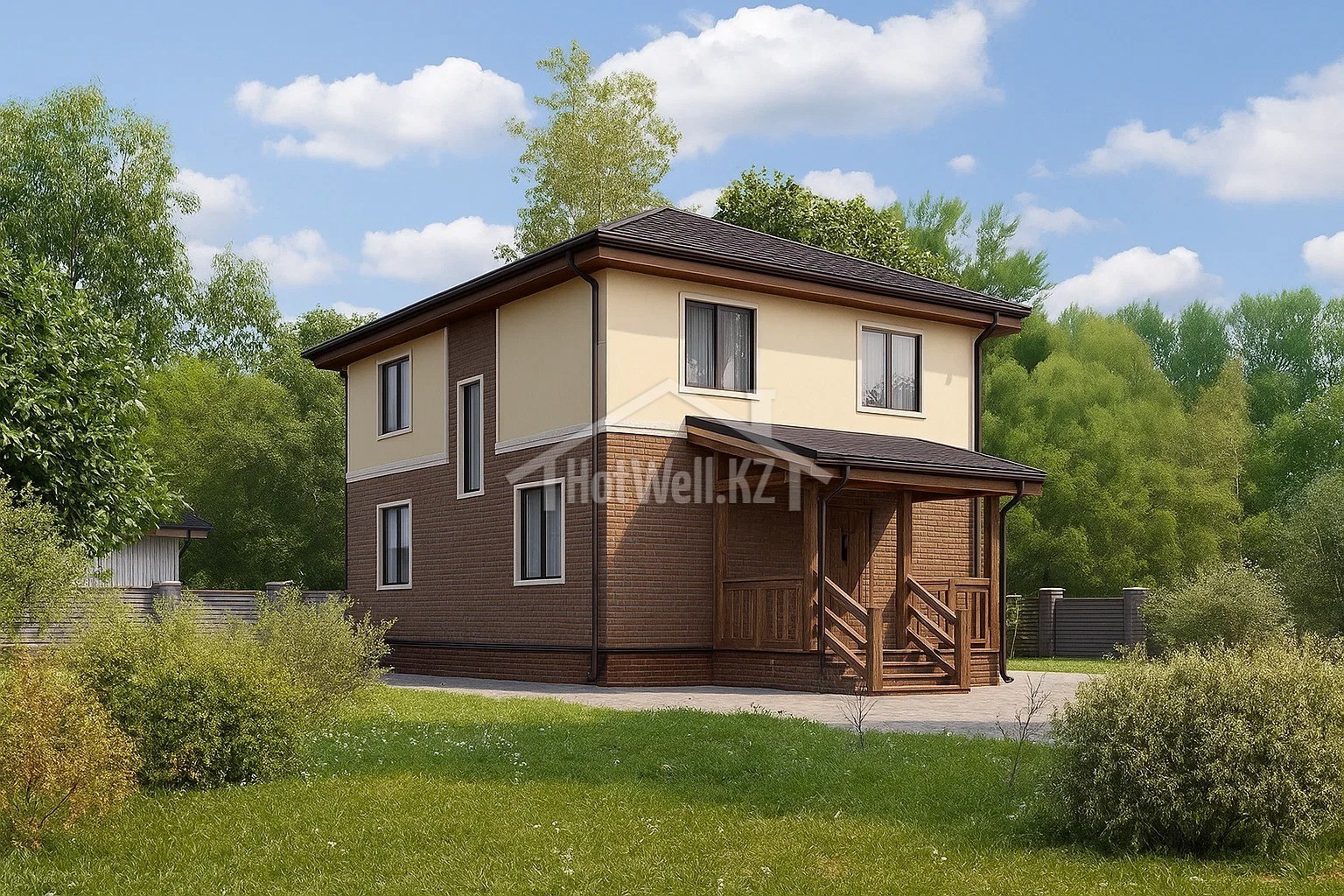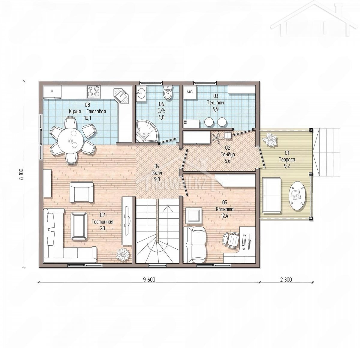 Двухэтажный дом 12 на 8 метров, общей площадью 165 м2, из СИП панелей, с бойлерной, террасой и спальней на первом этаже.