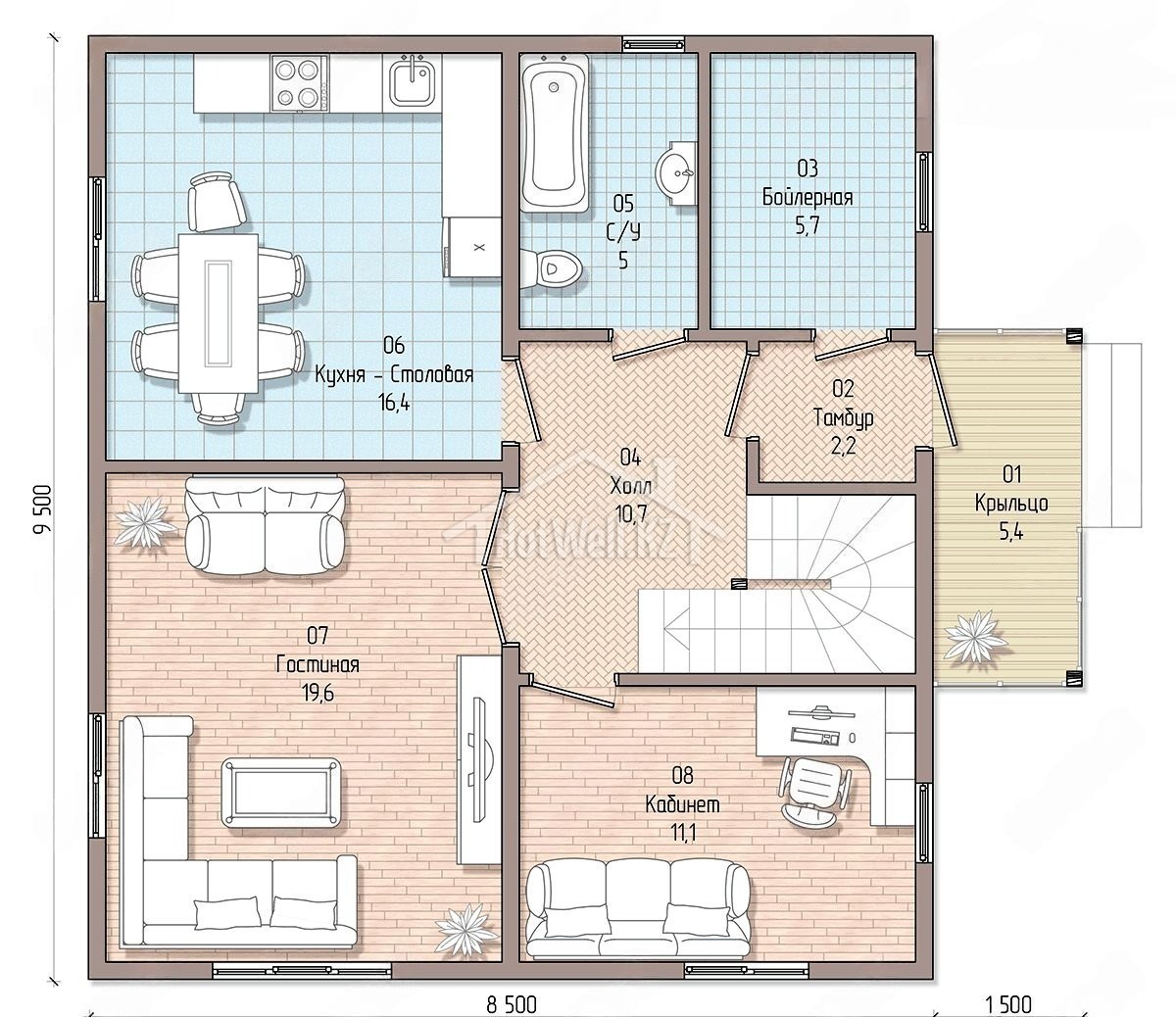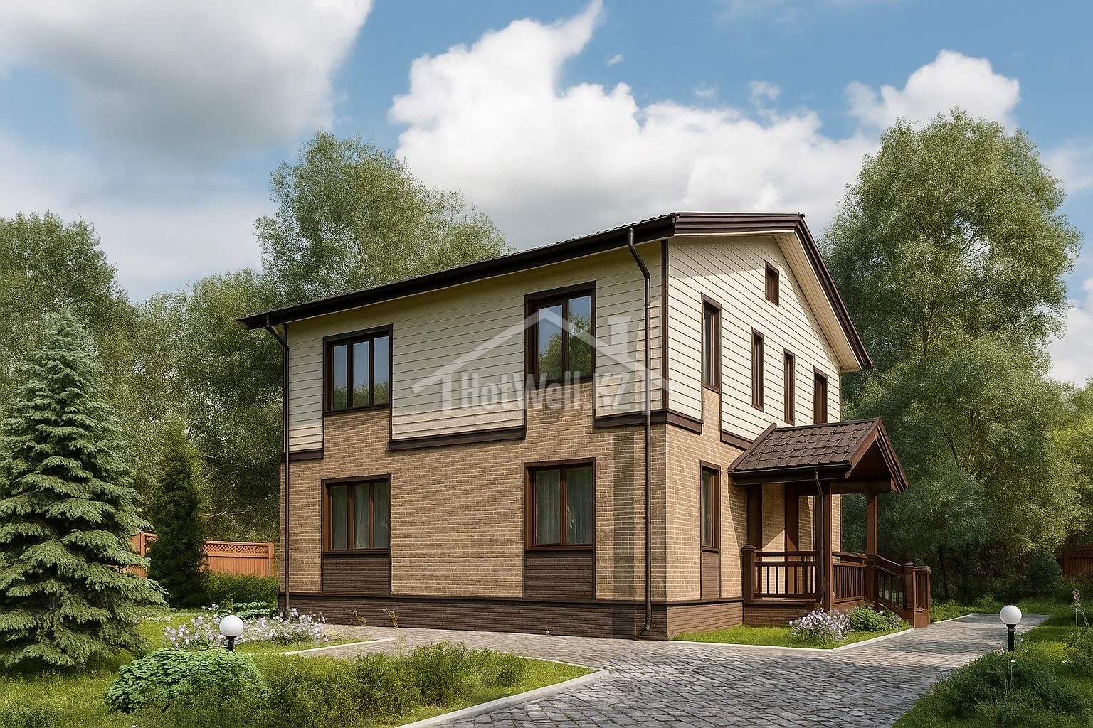 Двухэтажный дом 10 на 10 метров, общей площадью 167 м2, из СИП панелей, с бойлерной и спальней на первом этаже.