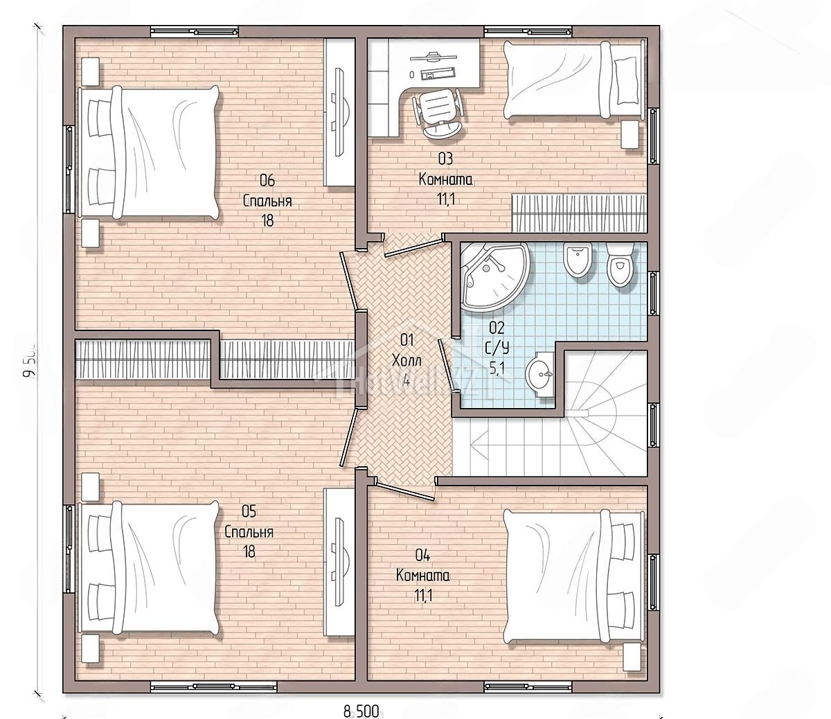 Данный проект дома основан на основе популярного проекта А-100, разница в том что у данного проекта вынесено за пределы дома тех помещение с тамбуром. Проект имеет большую гостинную на первом этаже 22 м2, отдельную кухню. Второй этаж имеет три спальни и сан узел. Тип крыши двускатная. Очень хороший и популярный проект.