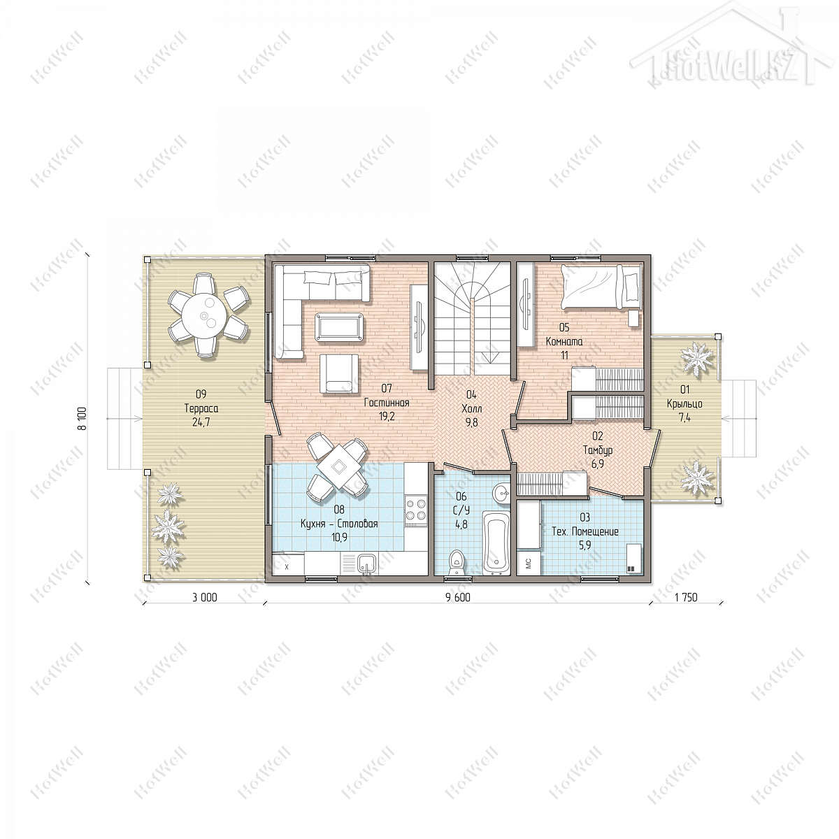 Двухэтажный дом 14 на 8 метров, общей площадью 187 м2, из СИП панелей, с бойлерной, террасой и спальней на первом этаже.