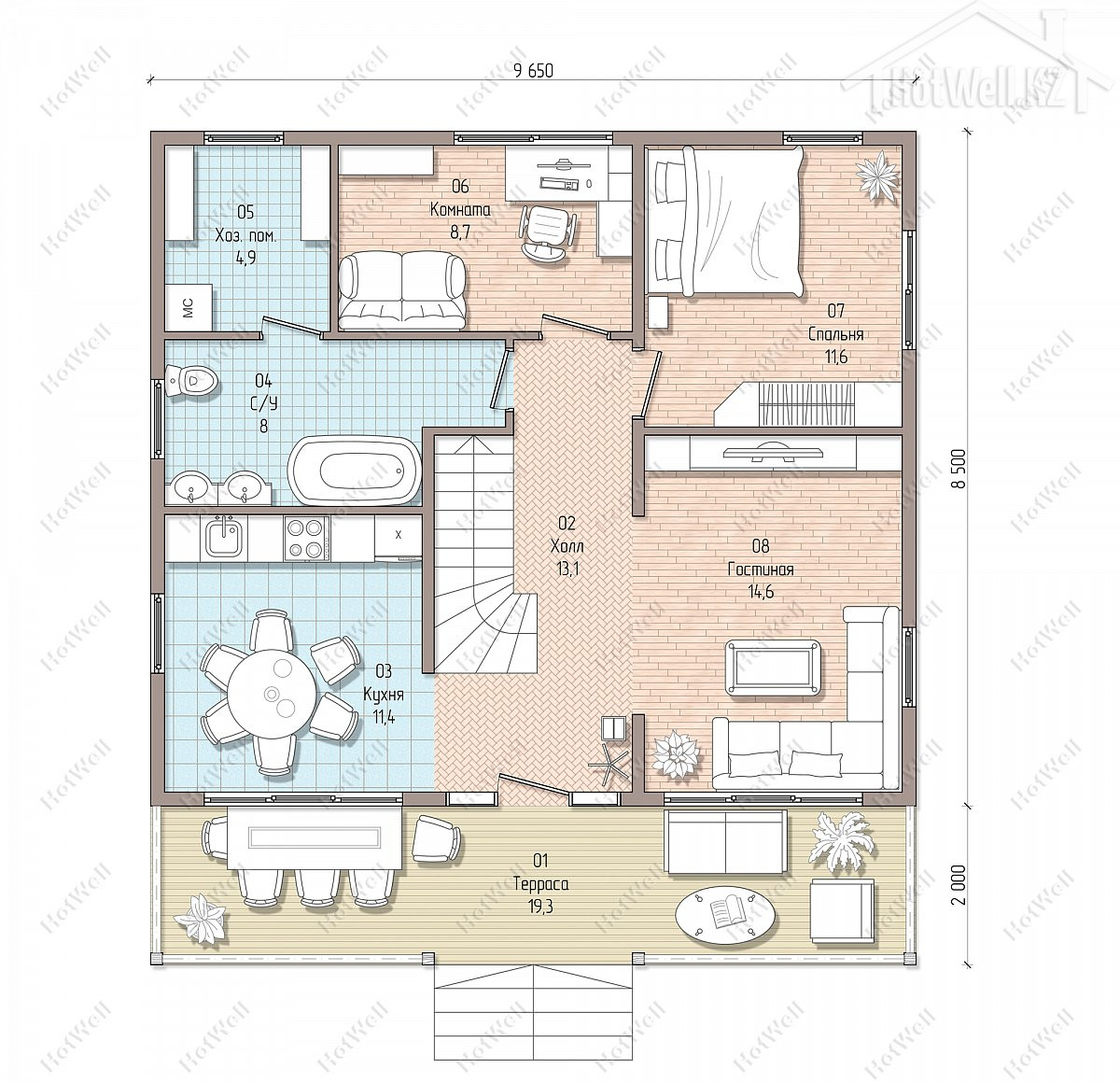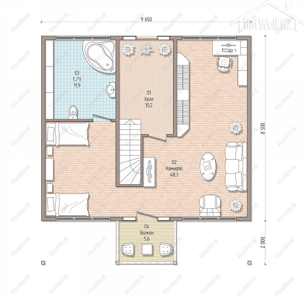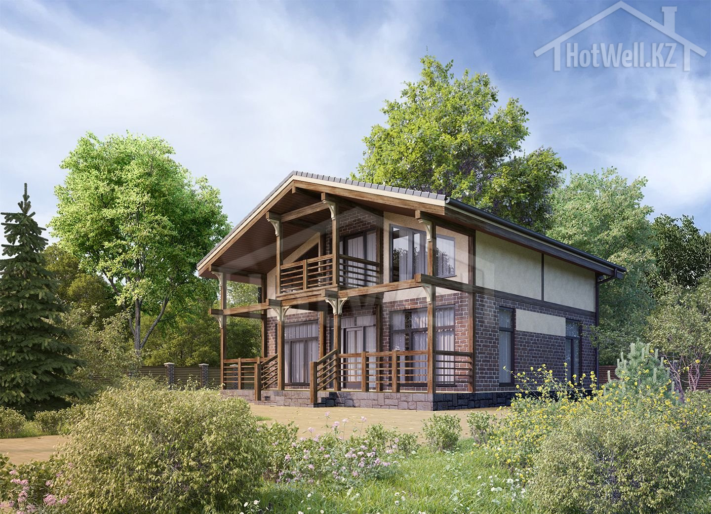 Дом с мансардой 11 на 10 метров, общей площадью 189 м2, из СИП панелей, с бойлерной, террасой, балконом и спальней на первом этаже.