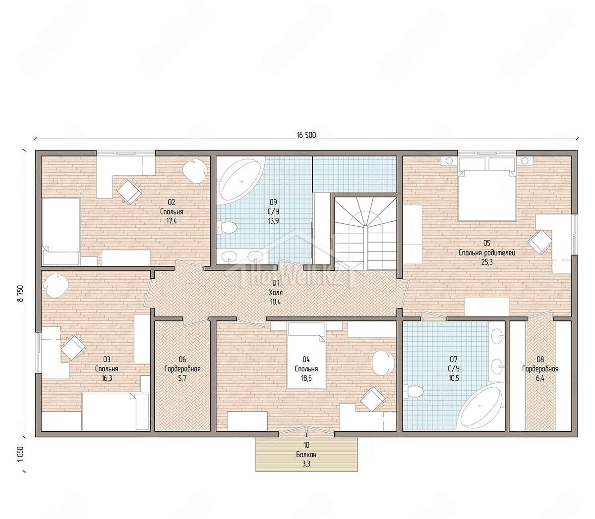 Дом с мансардой 17 на 14 метров, общей площадью 347 м2, из СИП панелей, с бойлерной, террасой, балконом и спальней на первом этаже.