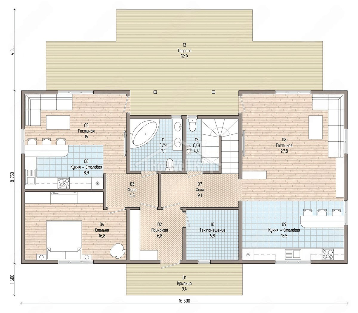Данный проект дома основан на основе популярного проекта А-100, разница в том что у данного проекта вынесено за пределы дома тех помещение с тамбуром. Проект имеет большую гостинную на первом этаже 22 м2, отдельную кухню. Второй этаж имеет три спальни и сан узел. Тип крыши двускатная. Очень хороший и популярный проект.