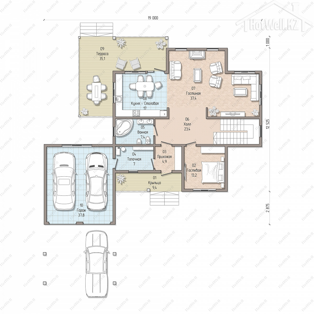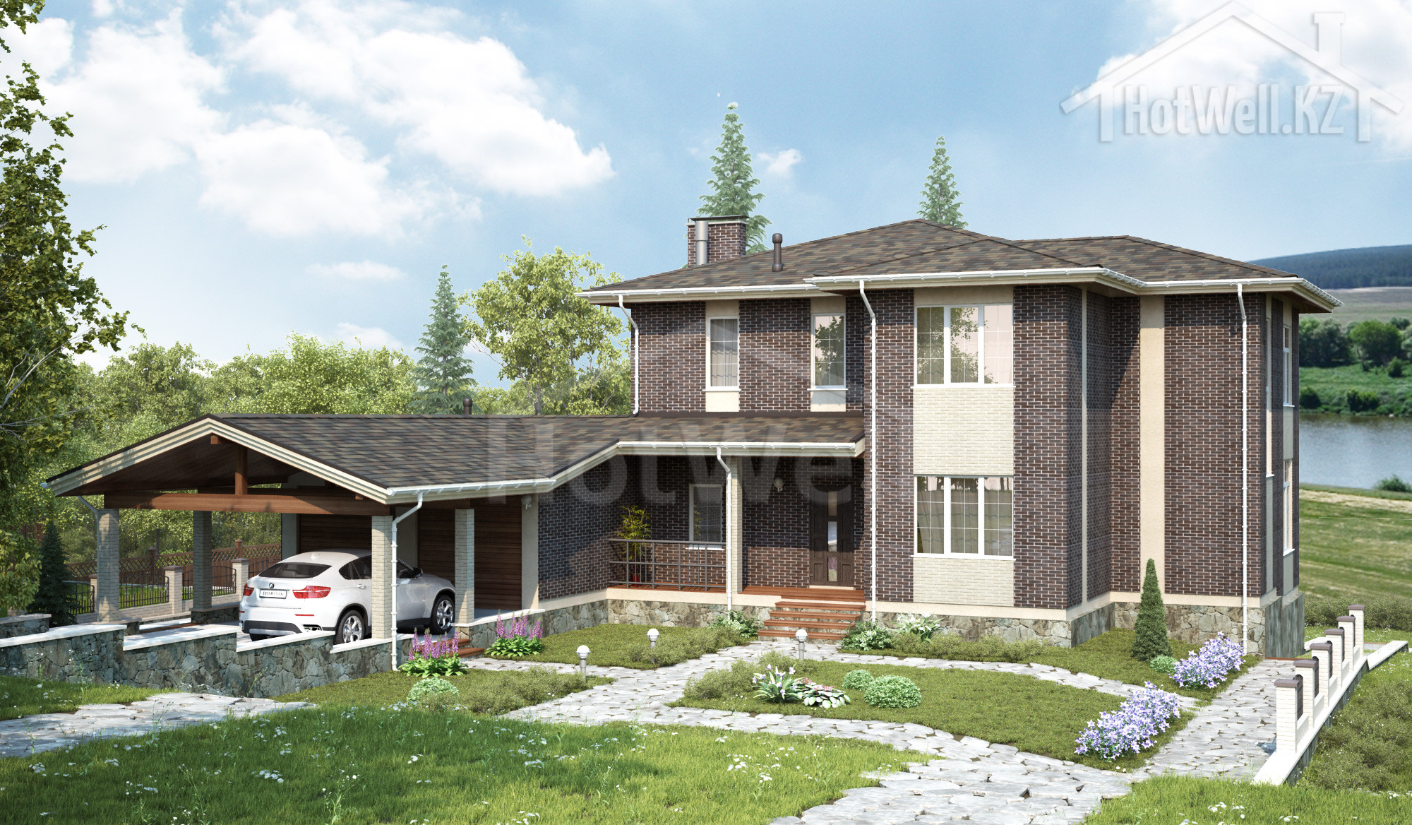 Двухэтажный дом 19 на 15 метров, общей площадью 354 м2, из СИП панелей, с бойлерной, гаражом, навесом, террасой, балконом и спальней на первом этаже.