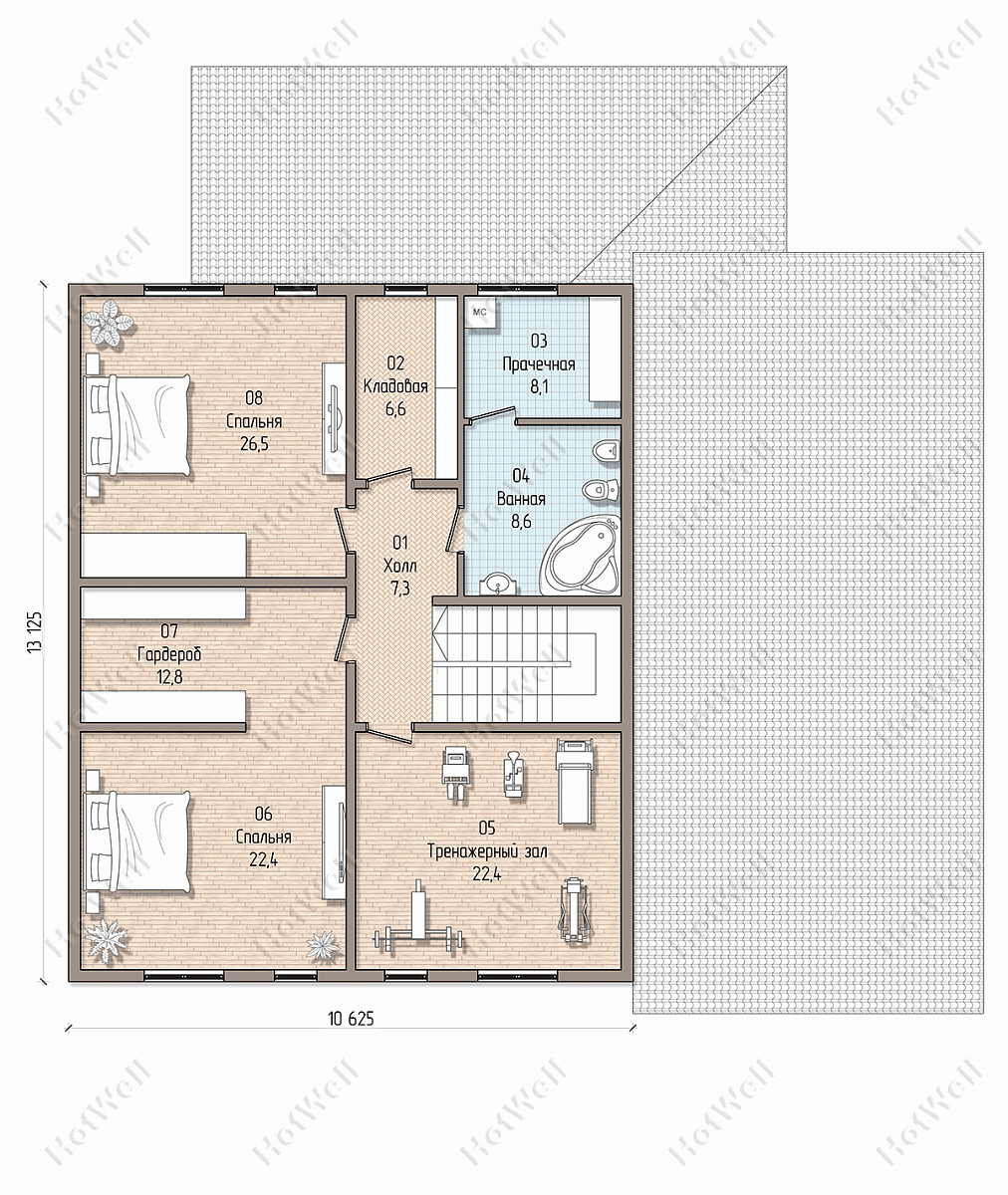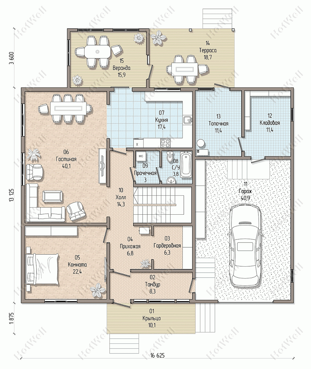 Дом с мансардой 19 на 17 метров, общей площадью 404 м2, из СИП панелей, с гаражом, террасой и спальней на первом этаже.