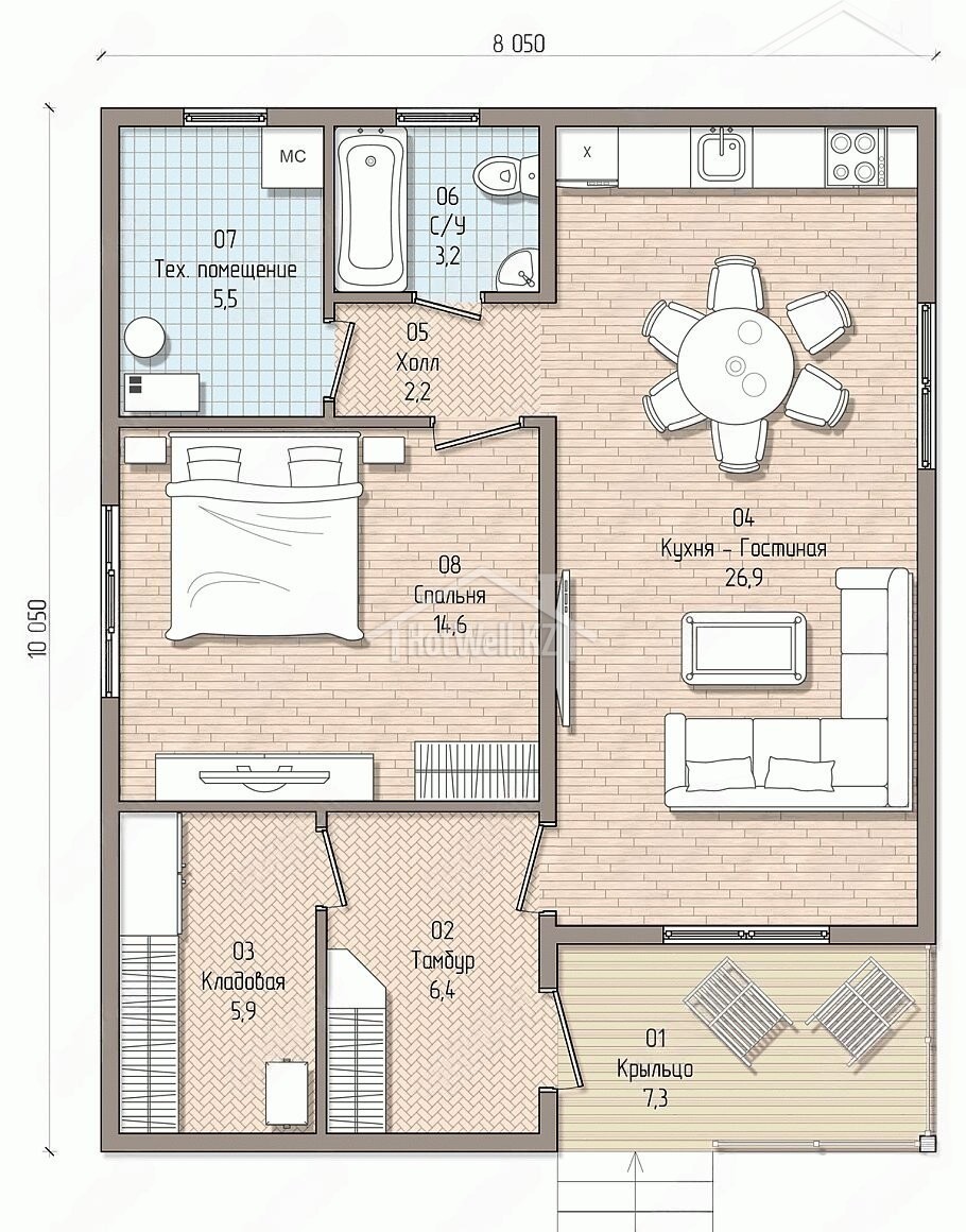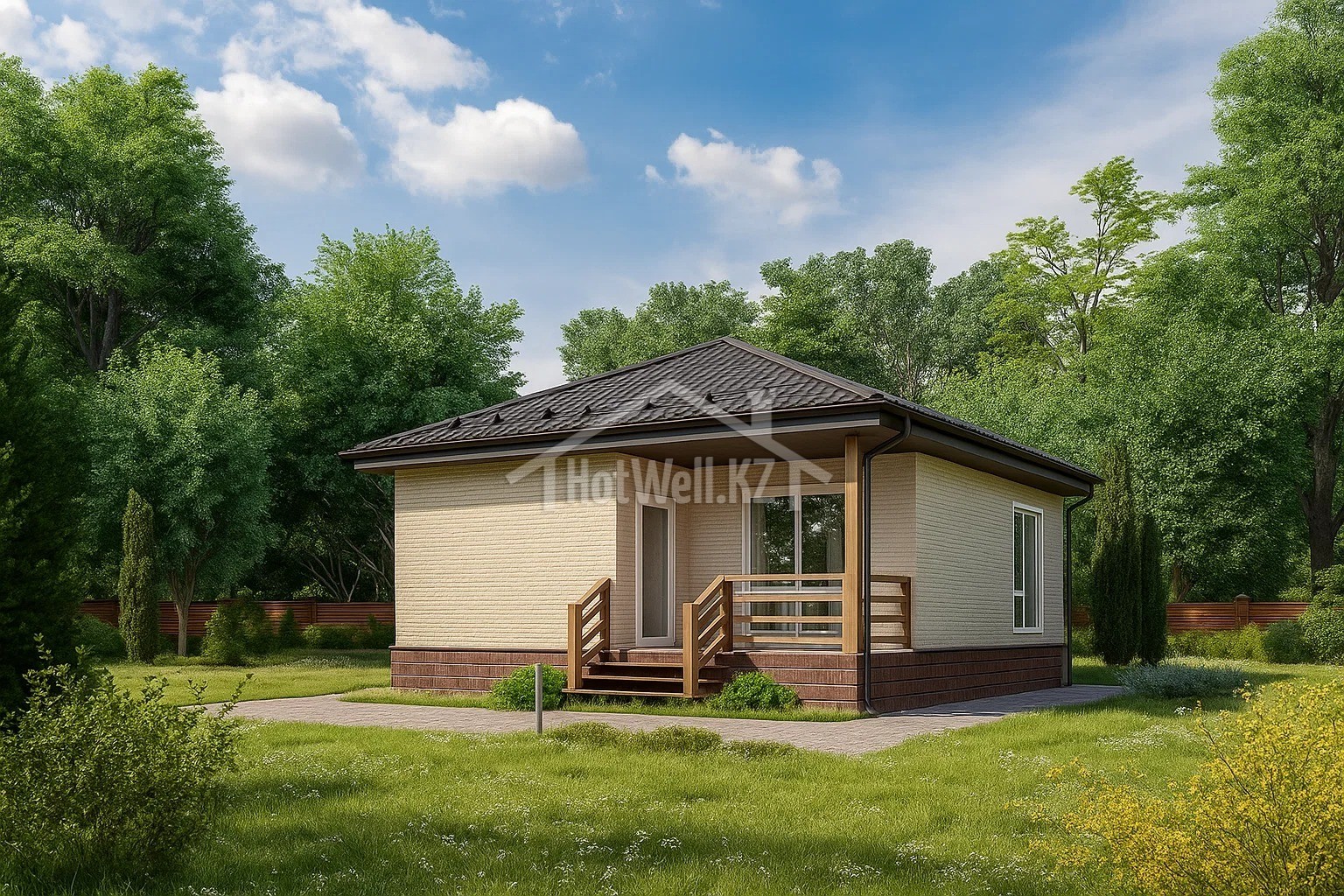 Одноэтажный дом 10 на 8 метров, общей площадью 80 м2, из СИП панелей, с бойлерной и спальней на первом этаже.