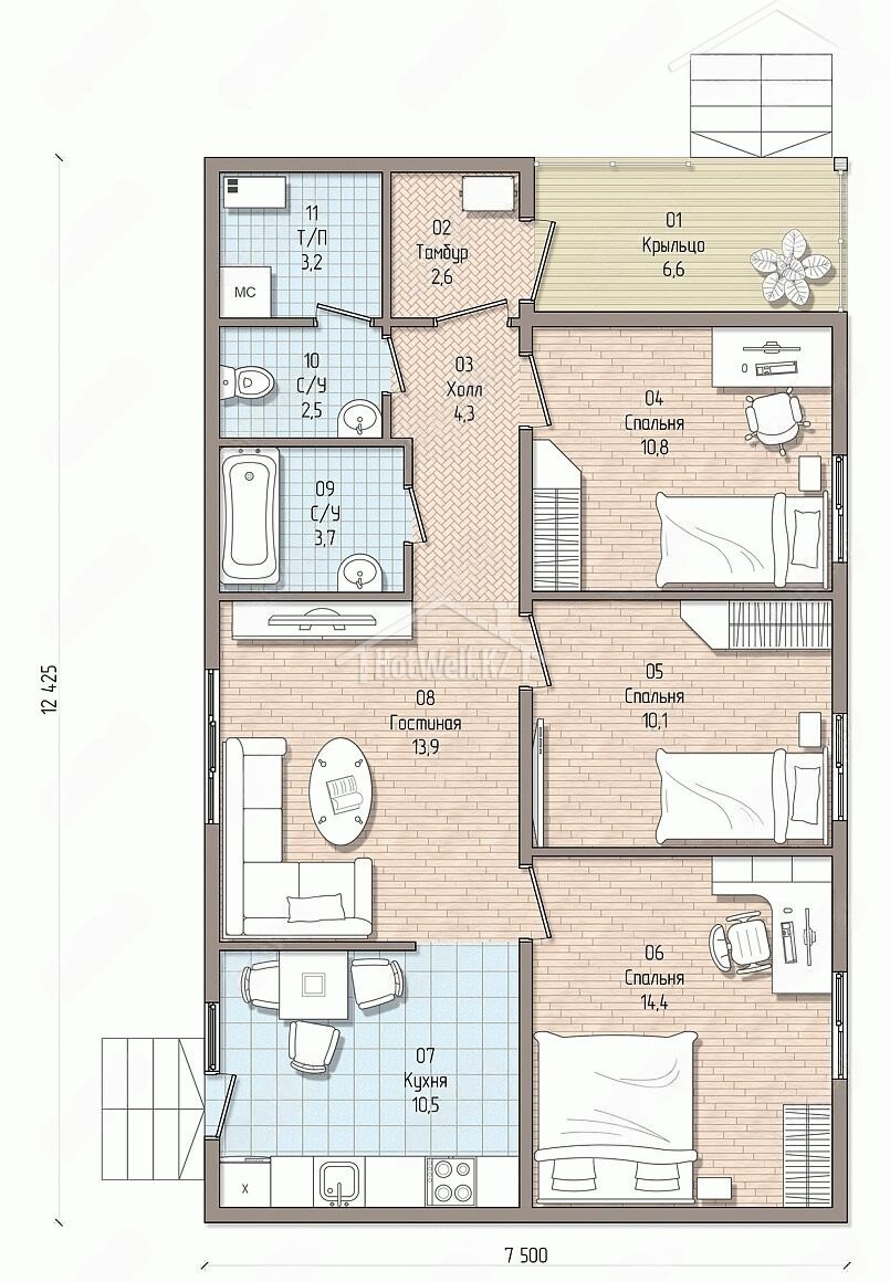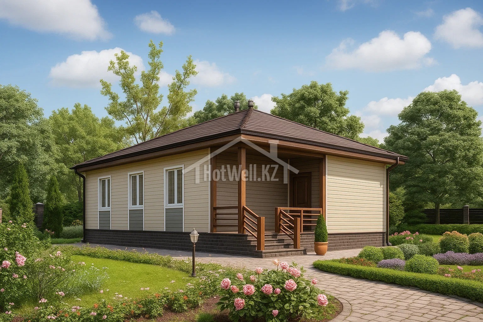 Одноэтажный дом 12 на 8 метров, общей площадью 93 м2, из СИП панелей, с бойлерной и спальней на первом этаже.