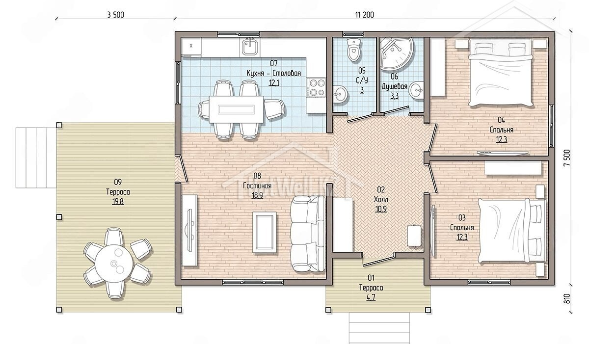 Одноэтажный дом 15 на 8 метров, общей площадью 106 м2, из СИП панелей, с террасой и спальней на первом этаже.