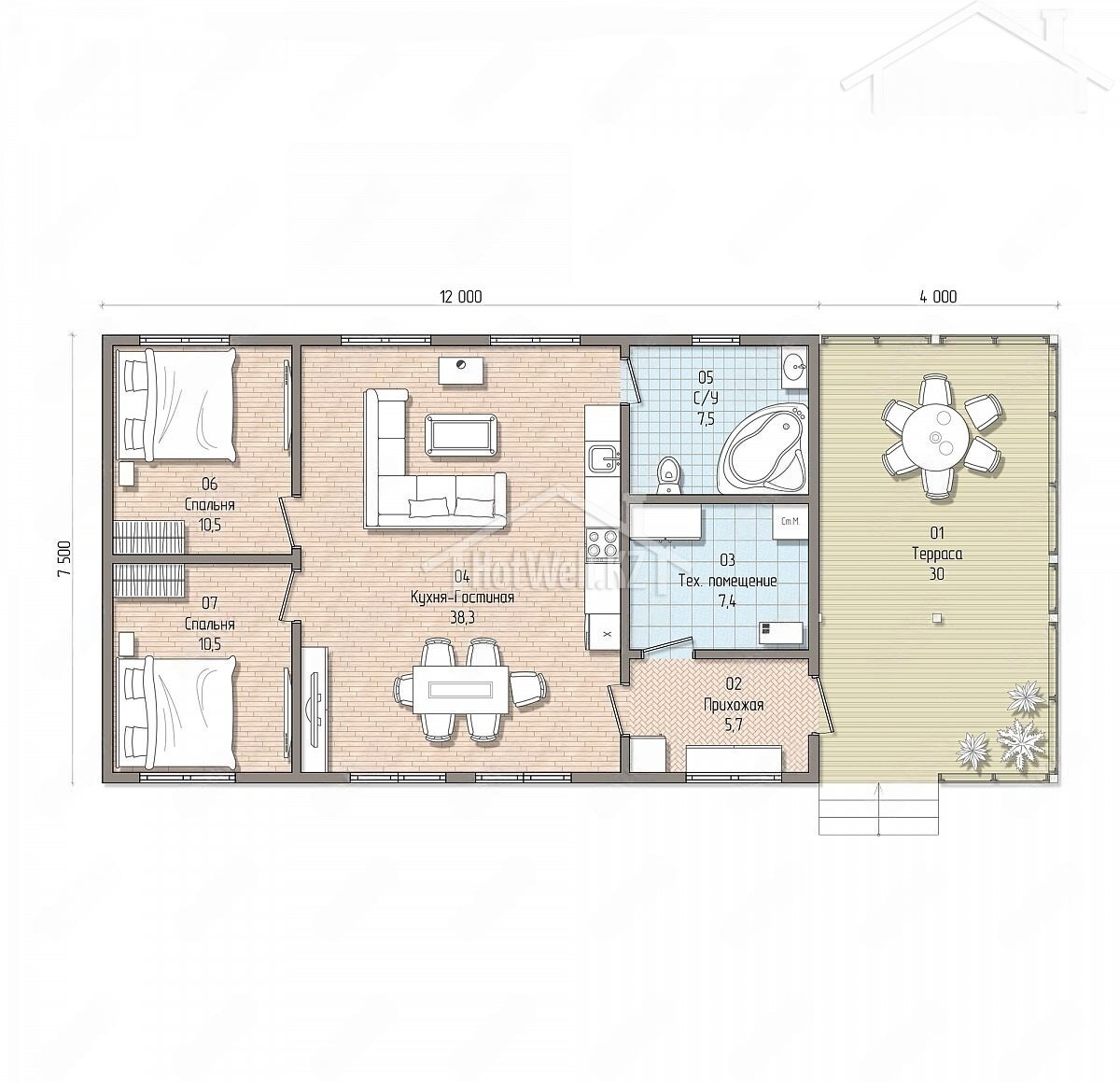 Одноэтажный дом 16 на 8 метров, общей площадью 120 м2, из СИП панелей, с бойлерной, террасой и спальней на первом этаже.