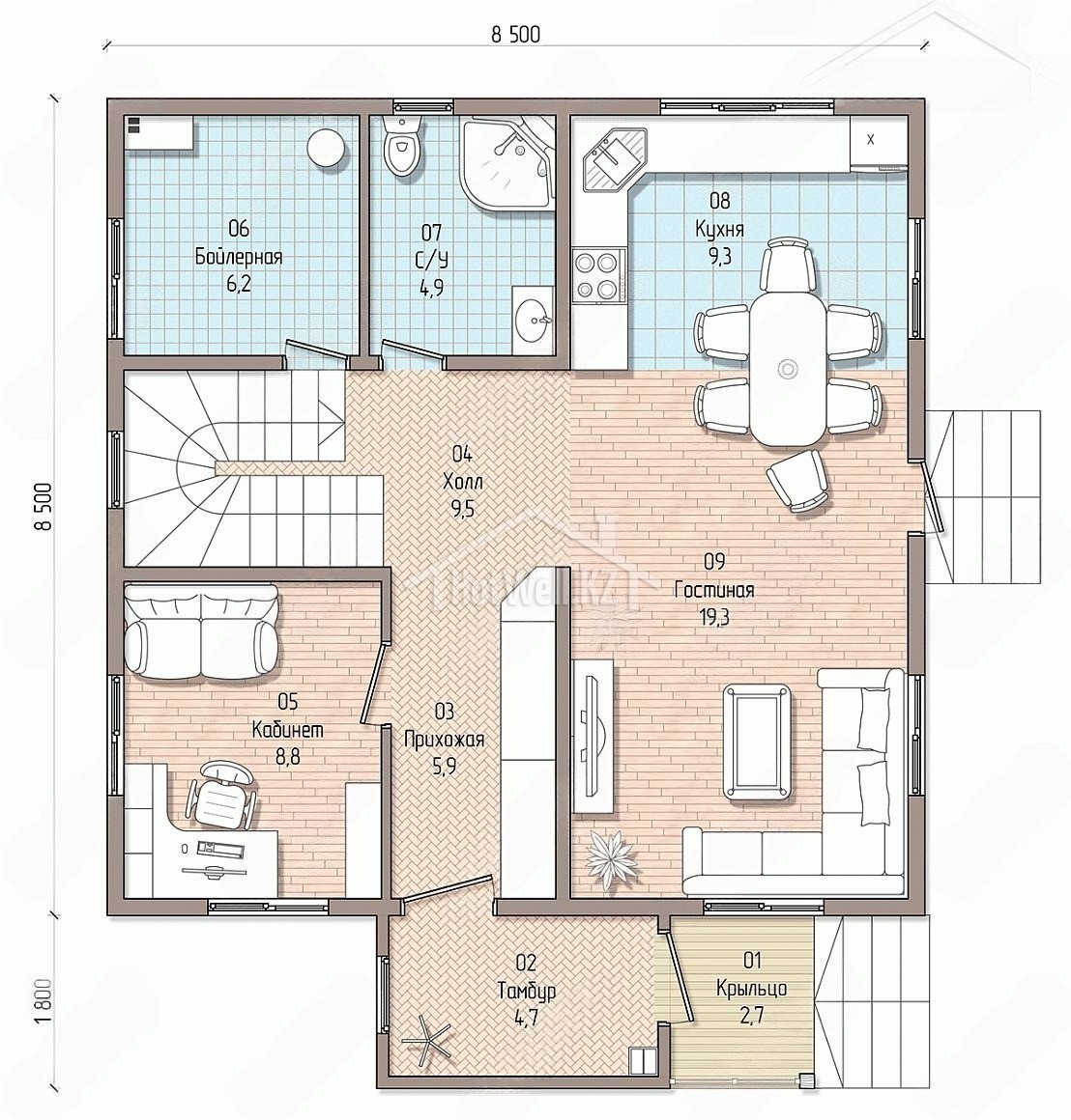 Двухэтажный дом 10 на 9 метров, общей площадью 152 м2, из СИП панелей, с бойлерной и спальней на первом этаже.