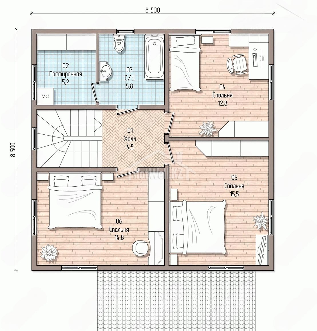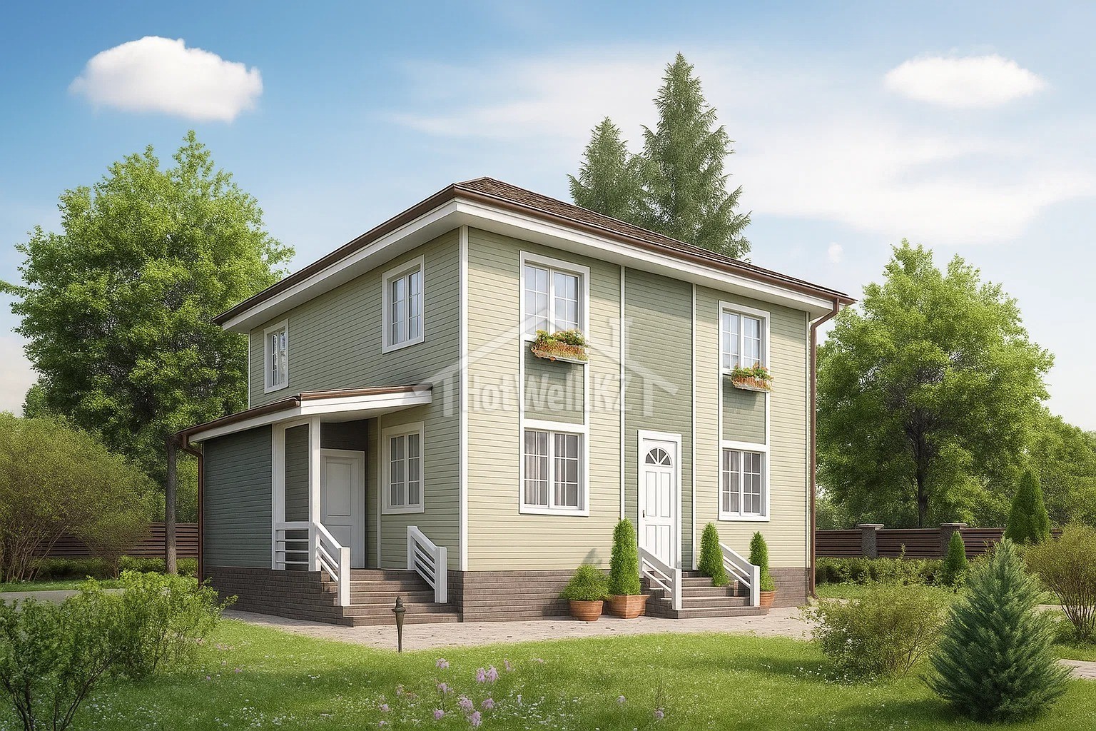 Данный проект дома основан на основе популярного проекта А-100, разница в том что у данного проекта вынесено за пределы дома тех помещение с тамбуром. Проект имеет большую гостинную на первом этаже 22 м2, отдельную кухню. Второй этаж имеет три спальни и сан узел. Тип крыши двускатная. Очень хороший и популярный проект.
