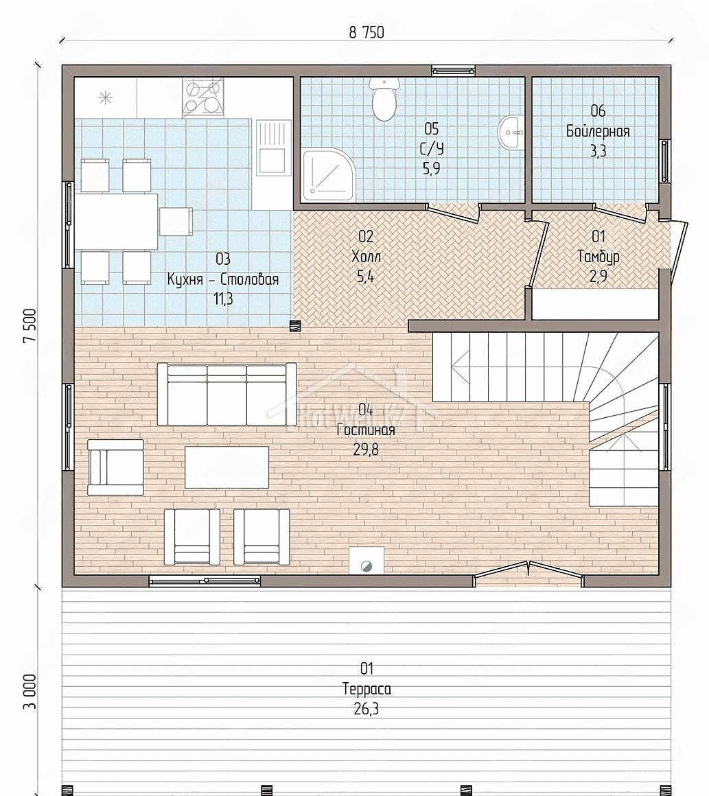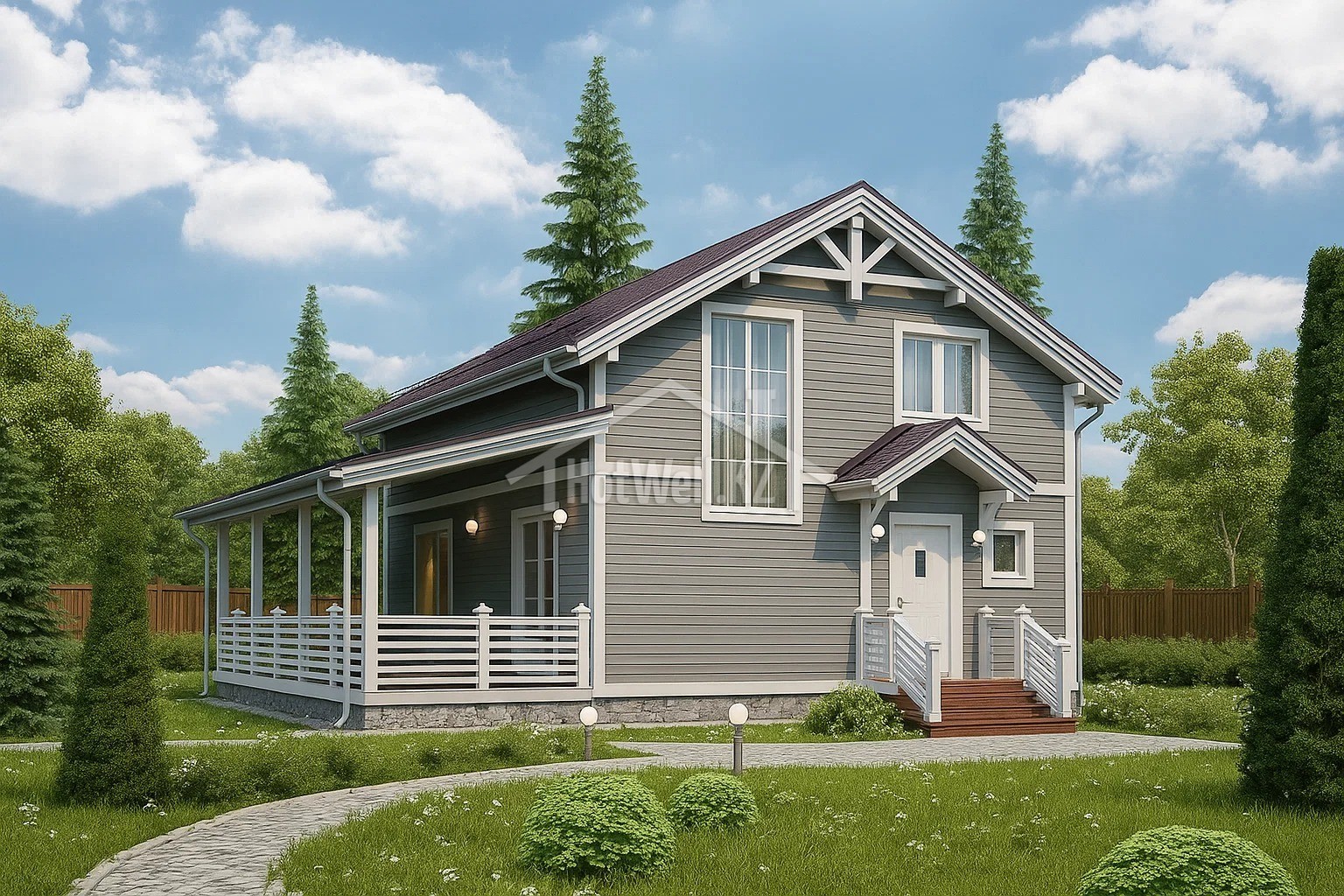 Дом с мансардой 11 на 9 метров, общей площадью 158 м2, из СИП панелей, с бойлерной, террасой и вторым светом.