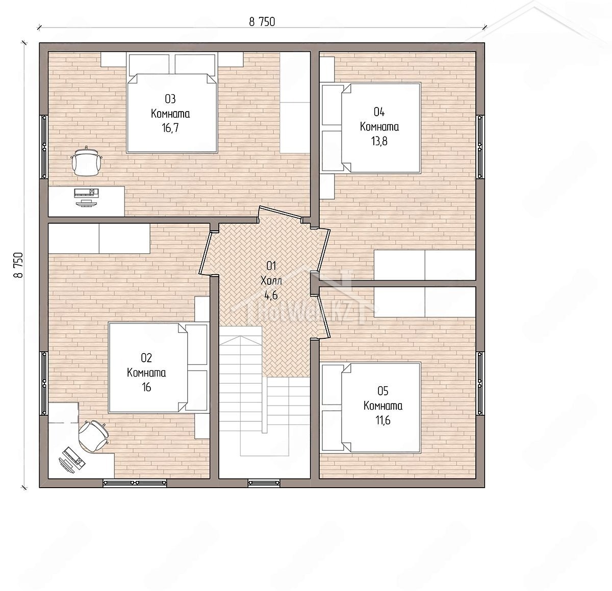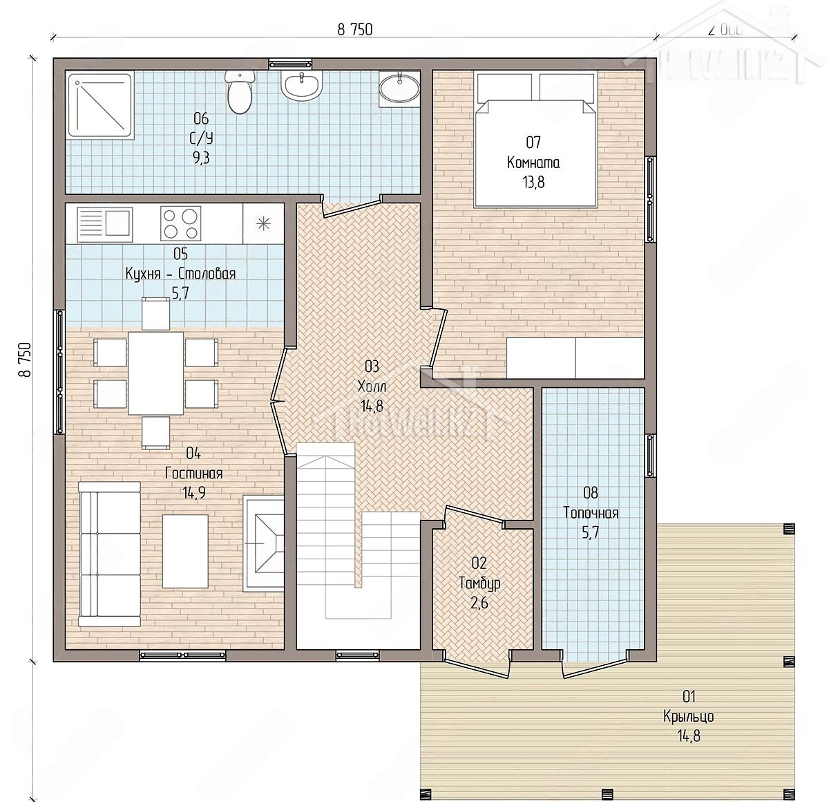 Двухэтажный дом 11 на 11 метров, общей площадью 168 м2, из СИП панелей, с бойлерной и спальней на первом этаже.