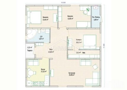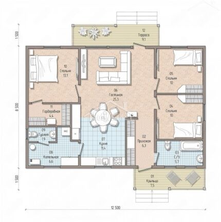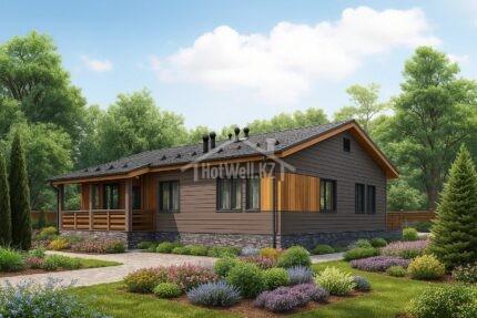 Дом с мансардой 14 на 11 метров, общей площадью 172 м2, из СИП панелей, с бойлерной, террасой и спальней на первом этаже.