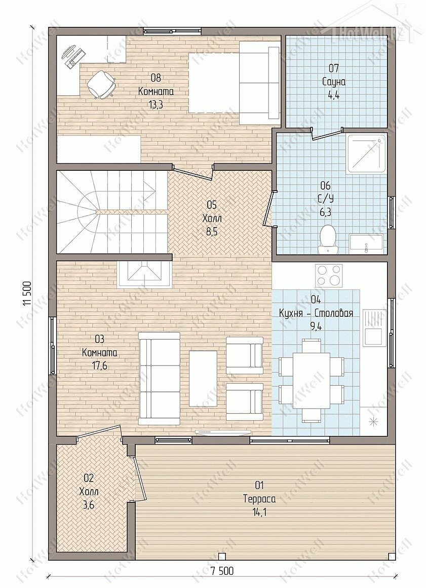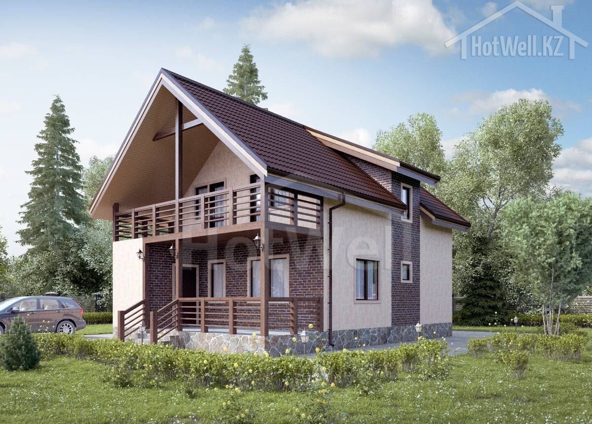 Дом с мансардой 12 на 8 метров, общей площадью 172 м2, из СИП панелей, с сауной, террасой, балконом и спальней на первом этаже.