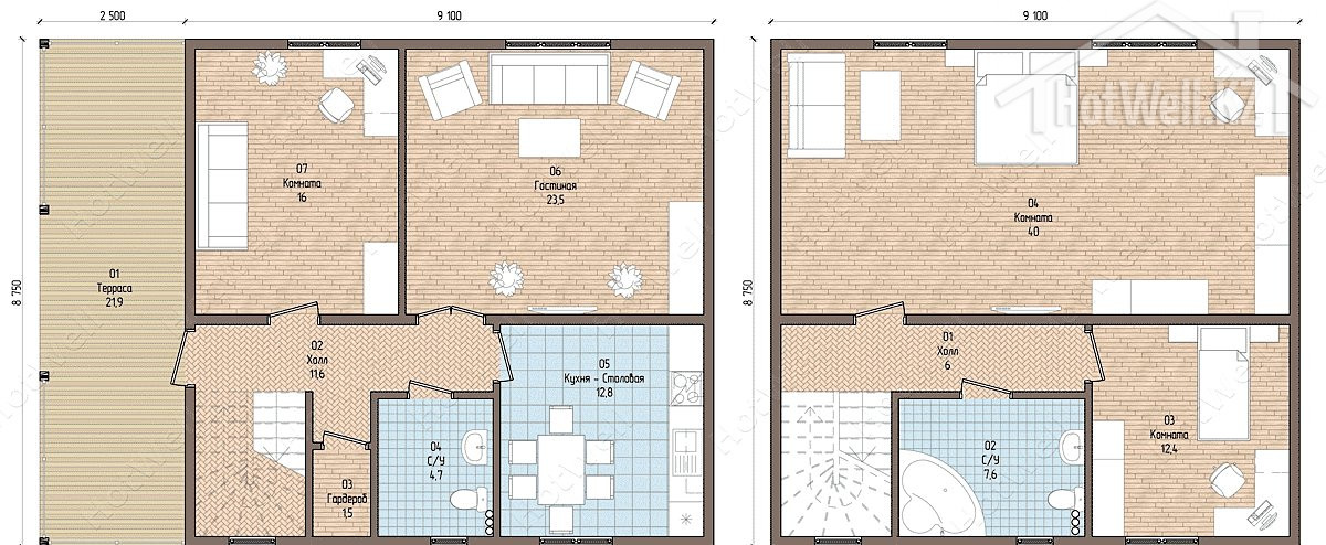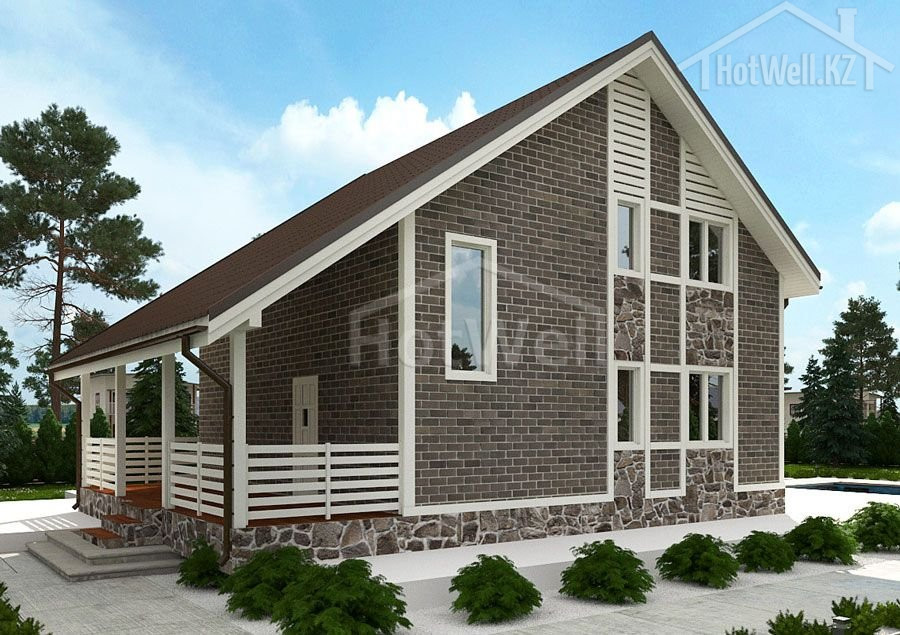 Данный проект дома основан на основе популярного проекта А-100, разница в том что у данного проекта вынесено за пределы дома тех помещение с тамбуром. Проект имеет большую гостинную на первом этаже 22 м2, отдельную кухню. Второй этаж имеет три спальни и сан узел. Тип крыши двускатная. Очень хороший и популярный проект.