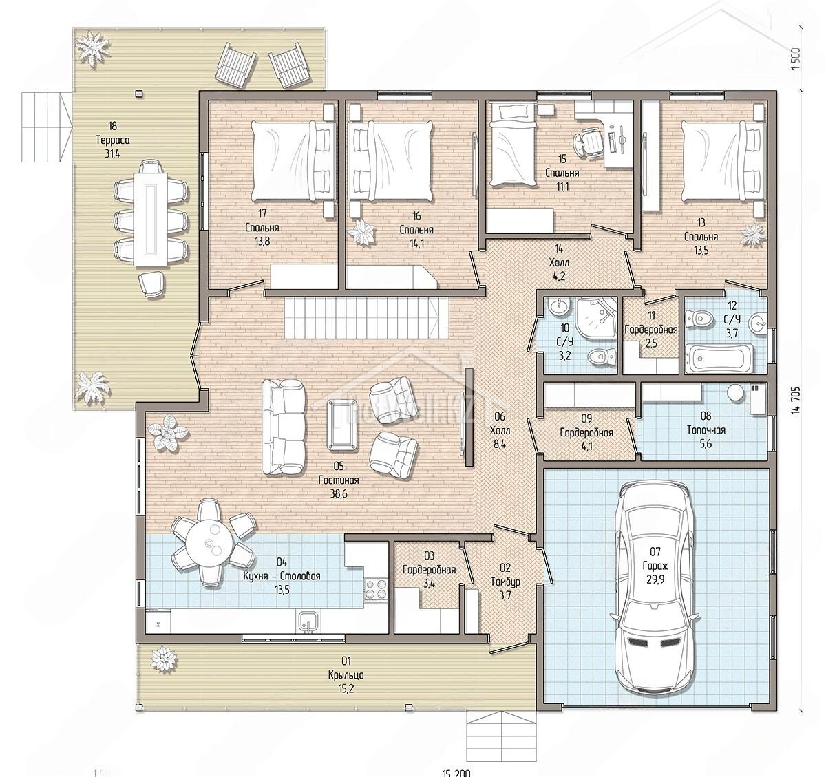 Одноэтажный дом 16 на 16 метров, общей площадью 243 м2, из СИП панелей, с бойлерной, гаражом, террасой и спальней на первом этаже.