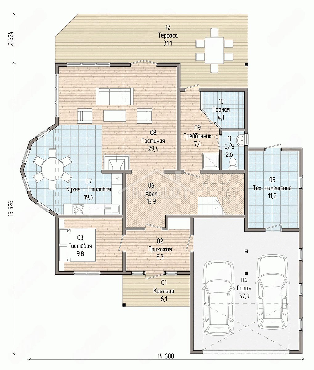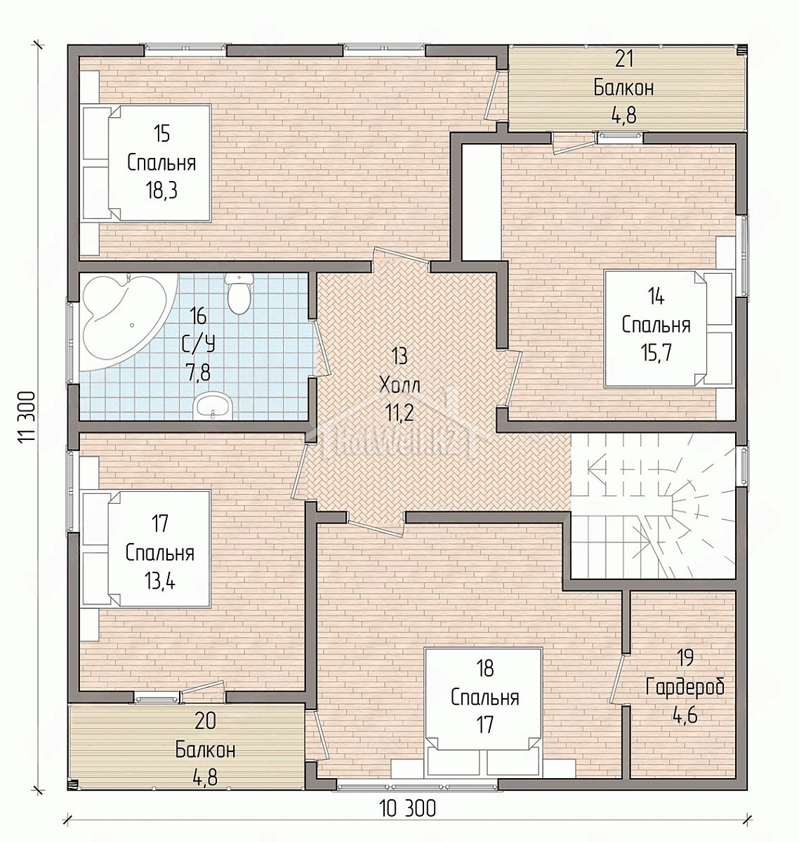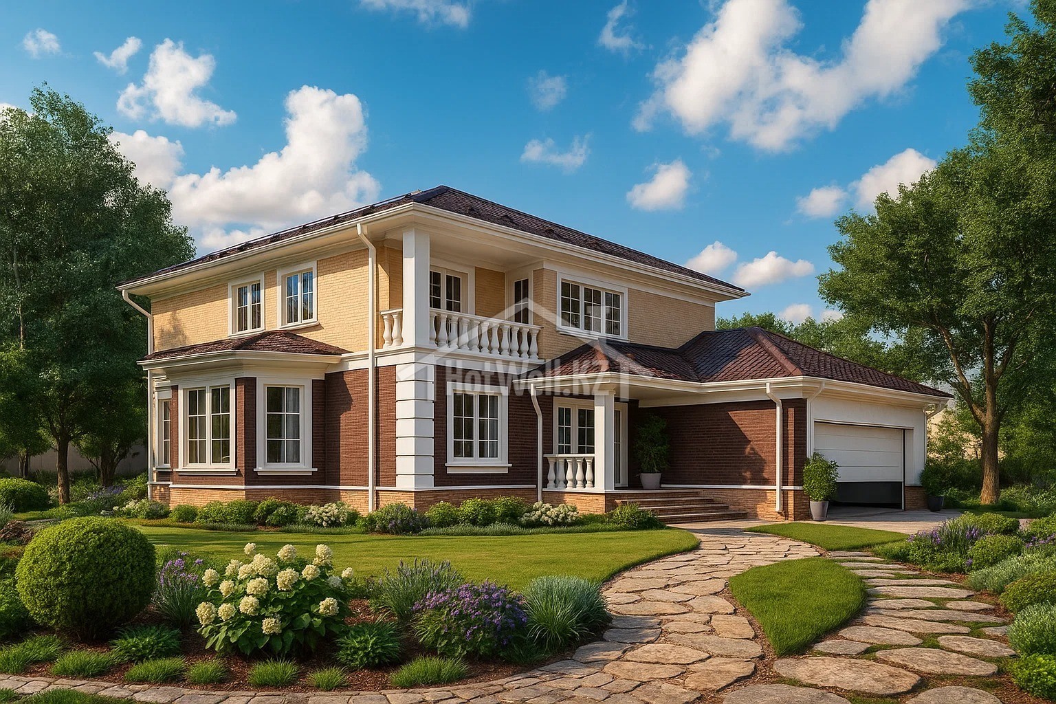 Двухэтажный дом 18 на 15 метров, общей площадью 317 м2, из СИП панелей, с сауной, бойлерной, гаражом, террасой, балконом, эркером и спальней на первом этаже.