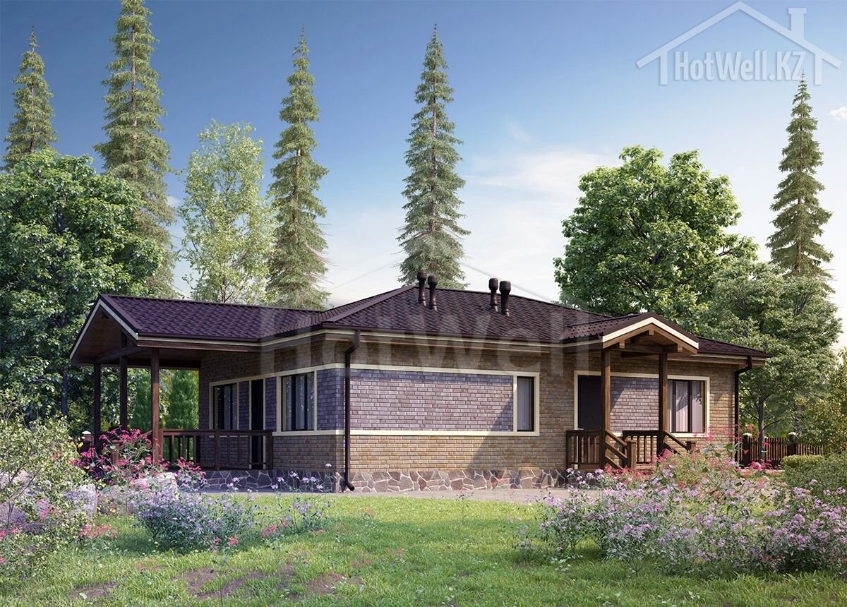 Одноэтажный дом 16 на 11 метров, общей площадью 132 м2, из СИП панелей, с бойлерной, террасой и спальней на первом этаже.