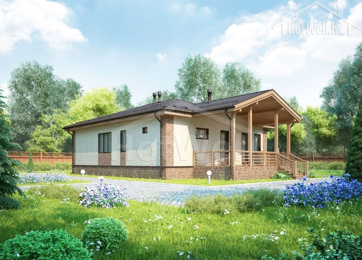Одноэтажный дом 17 на 10 метров, общей площадью 142 м2, из СИП панелей, с террасой и спальней на первом этаже.