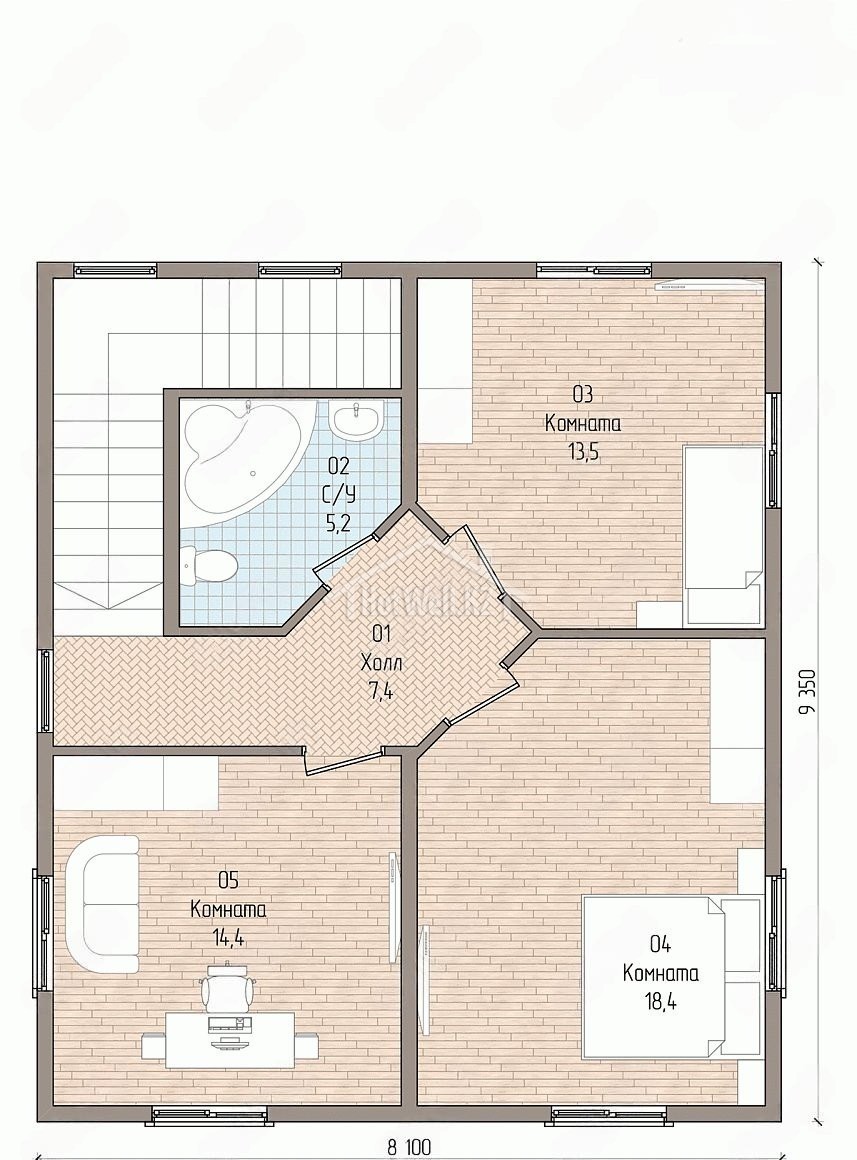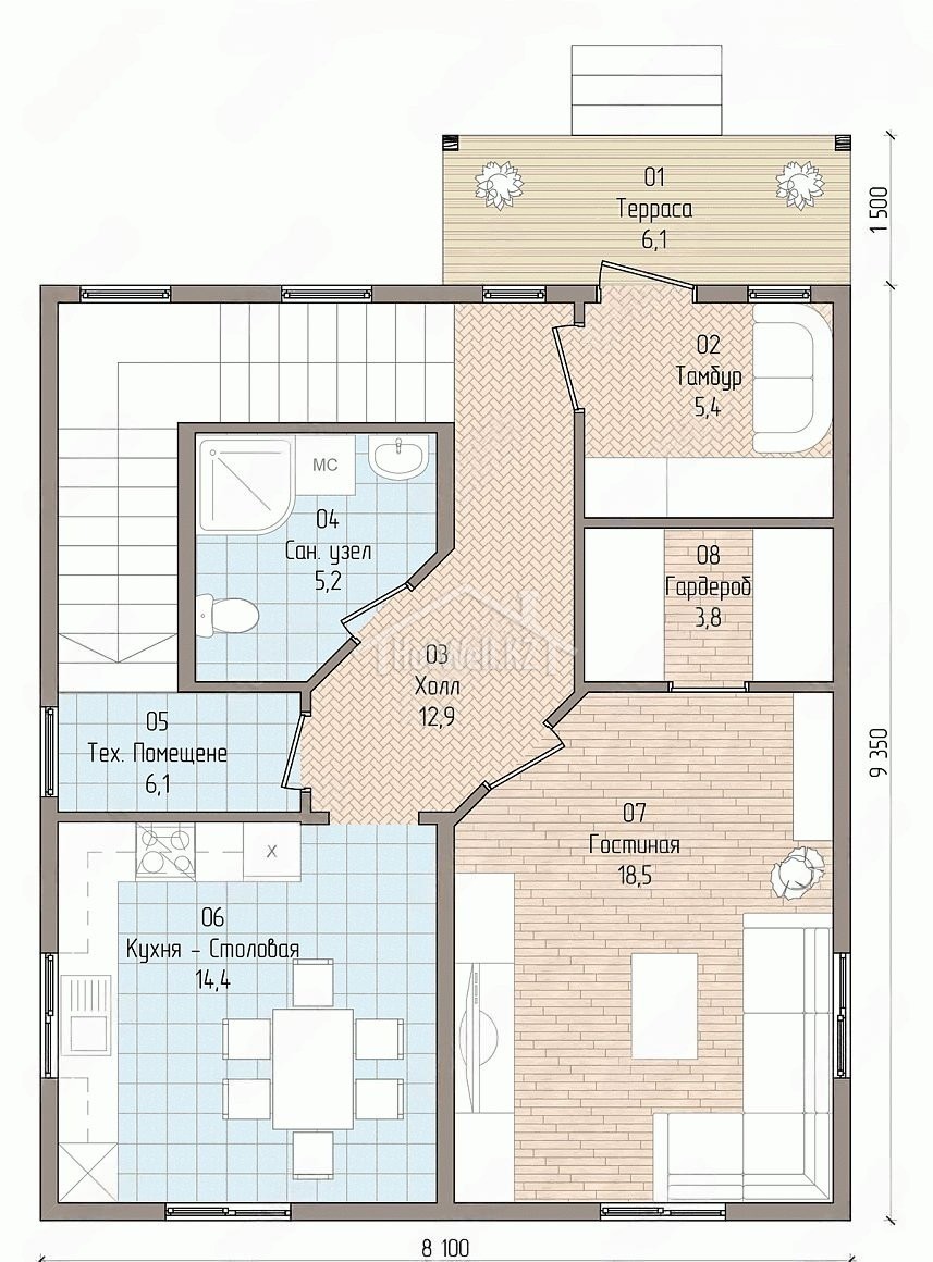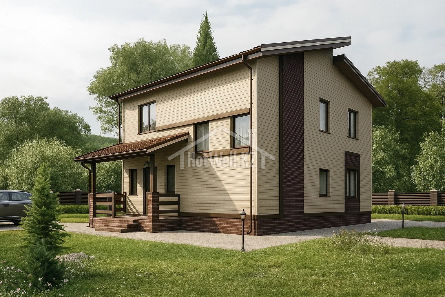 Двухэтажный дом 11 на 8 метров, общей площадью 158 м2, из СИП панелей, с бойлерной, террасой и спальней на первом этаже.
