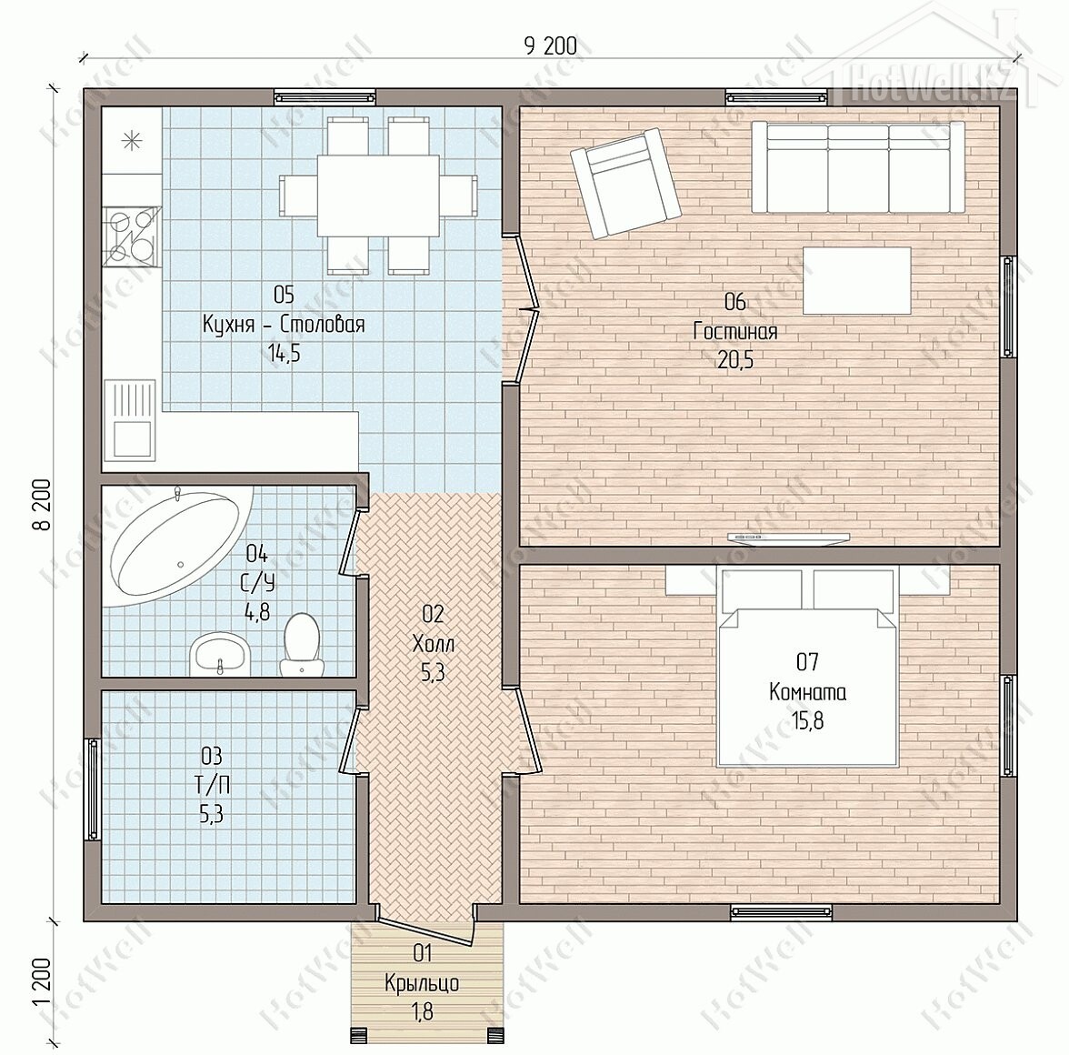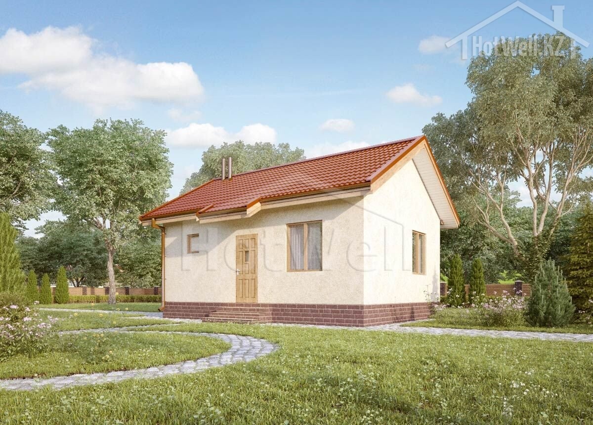 Одноэтажный дом 9 на 9 метров, общей площадью 77 м2, из СИП панелей, с бойлерной и спальней на первом этаже.