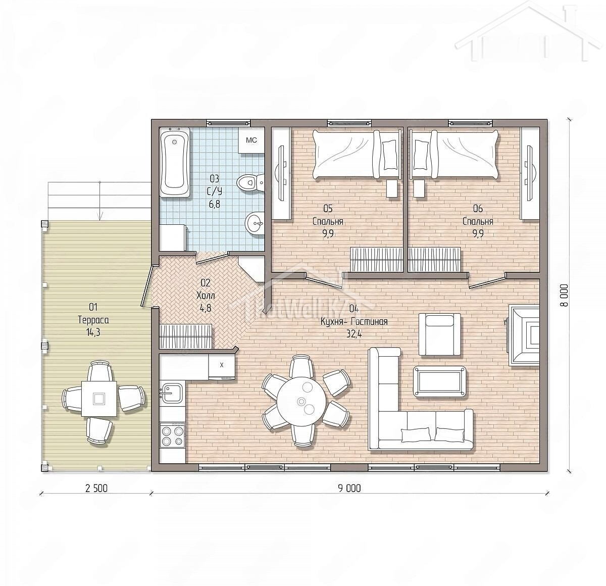 Одноэтажный дом 12 на 8 метров, общей площадью 86 м2, из СИП панелей, с террасой и спальней на первом этаже.
