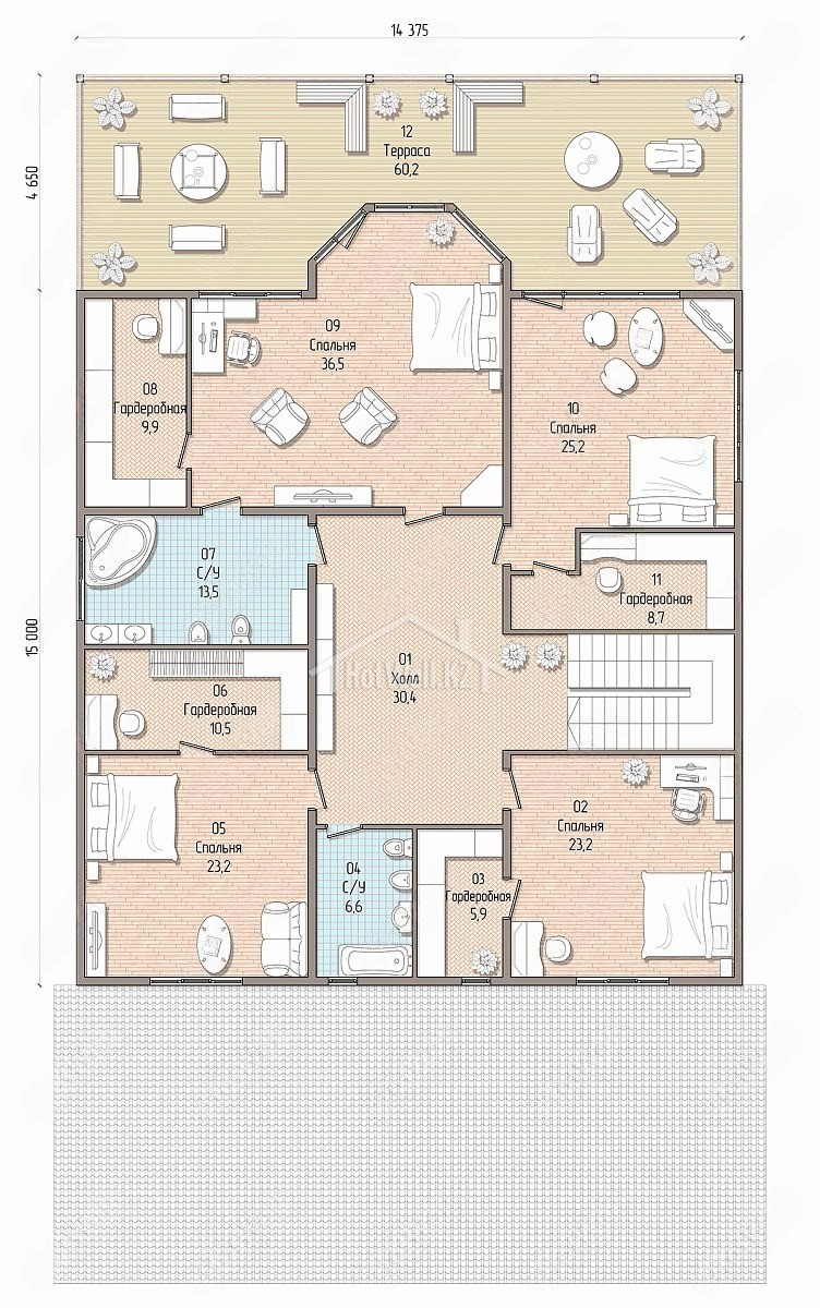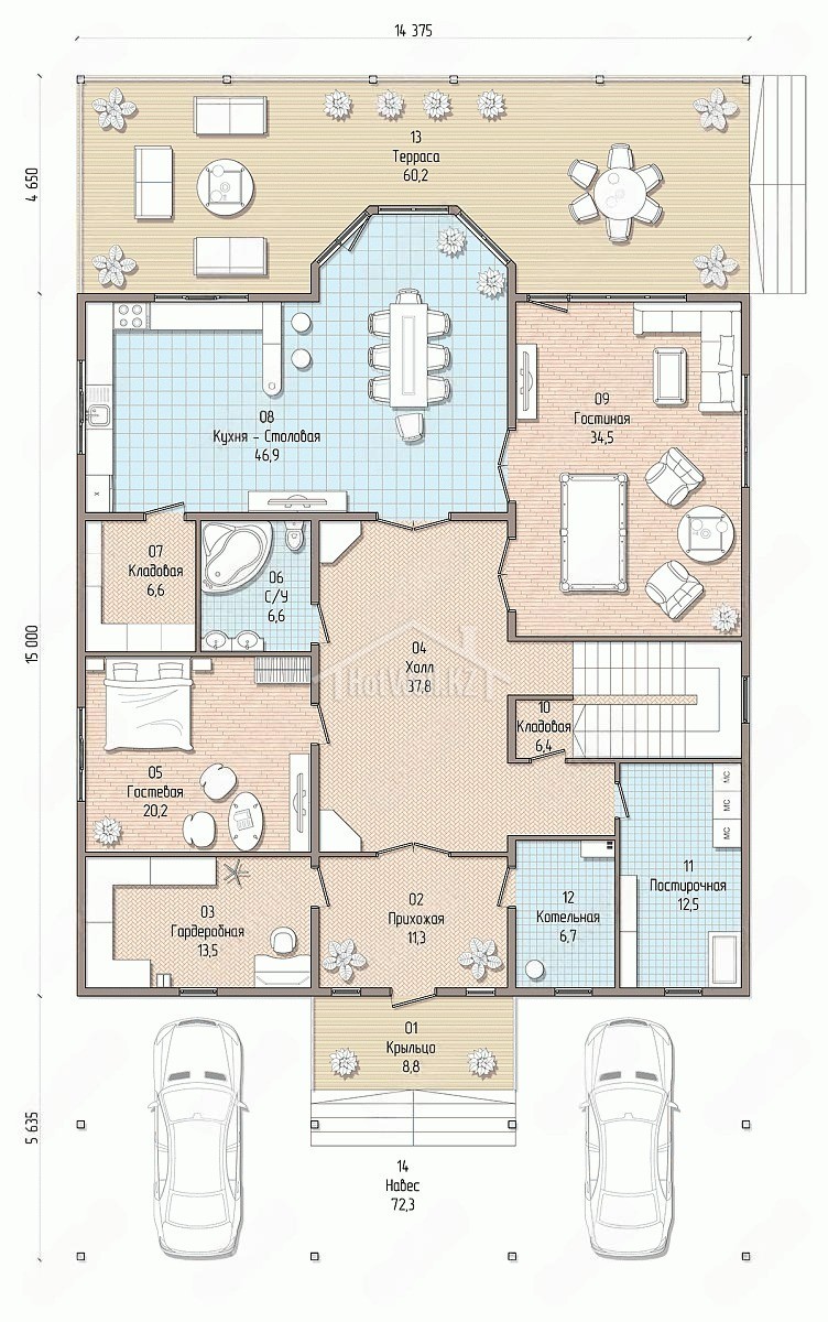 Двухэтажный дом 25 на 14 метров, общей площадью 646 м2, из СИП панелей, с бойлерной, навесом, террасой, балконом, эркером и спальней на первом этаже.