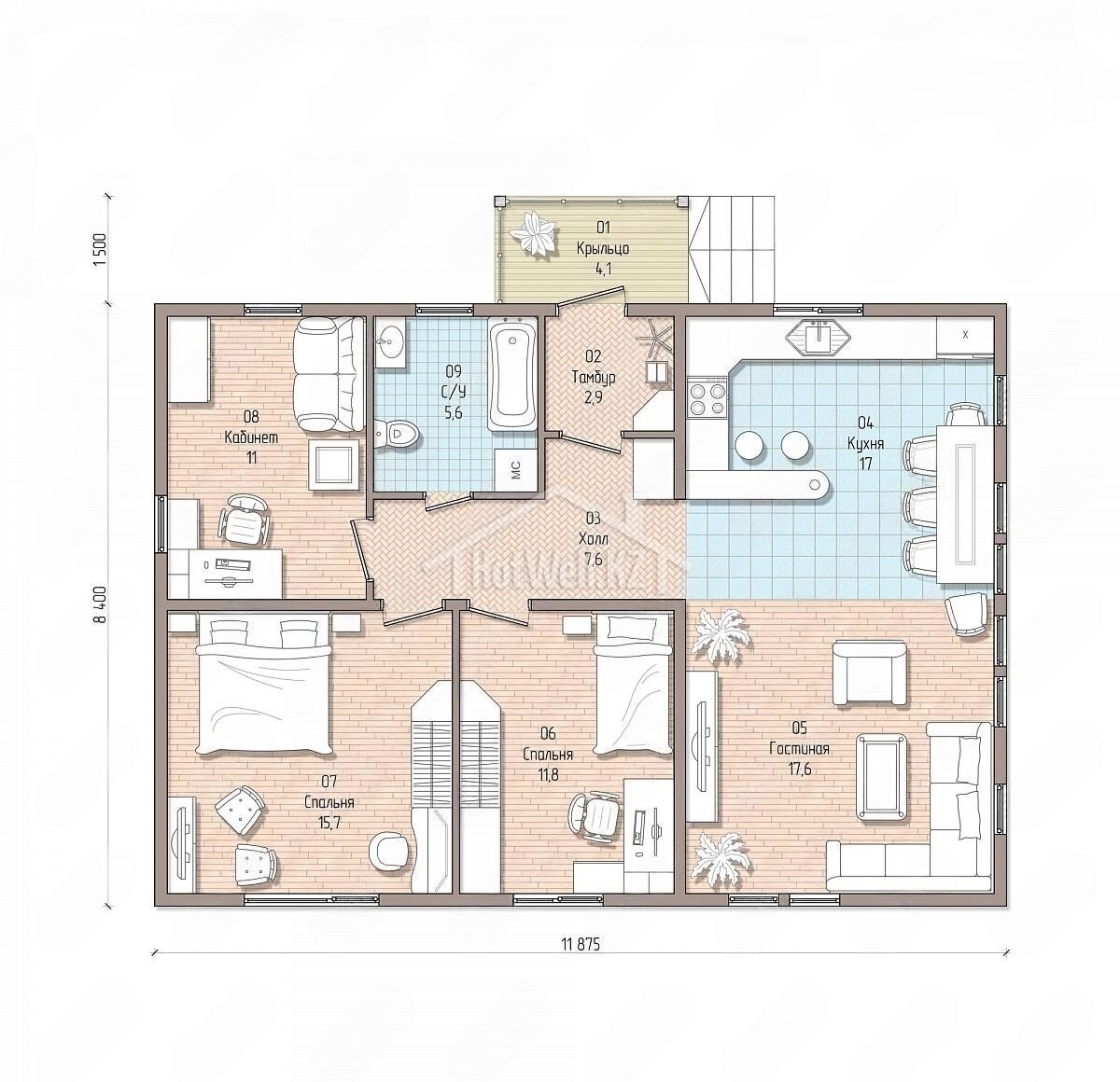 Одноэтажный дом 12 на 10 метров, общей площадью 103 м2, из СИП панелей, с бойлерной и спальней на первом этаже.