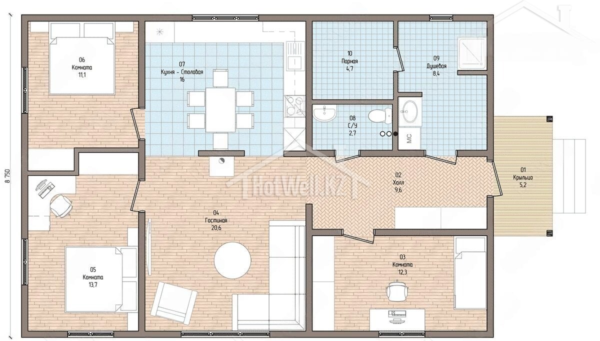 Одноэтажный дом 14 на 9 метров, общей площадью 117 м2, из СИП панелей, с сауной и спальней на первом этаже.