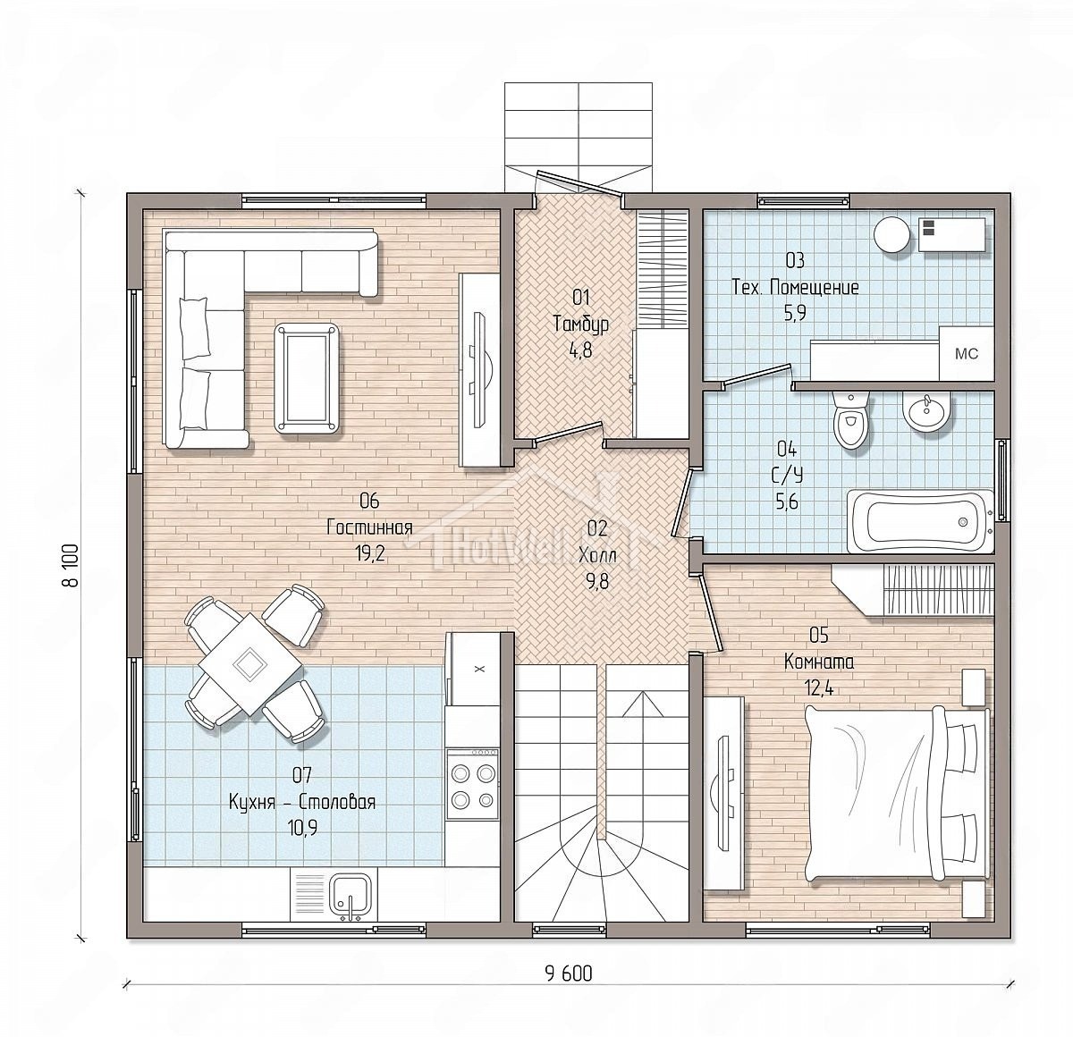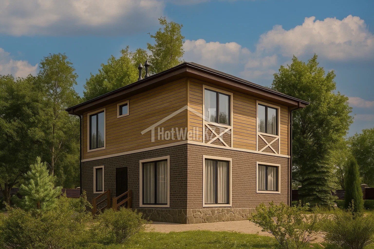 Двухэтажный дом 10 на 8 метров, общей площадью 155 м2, из СИП панелей, с бойлерной и спальней на первом этаже.