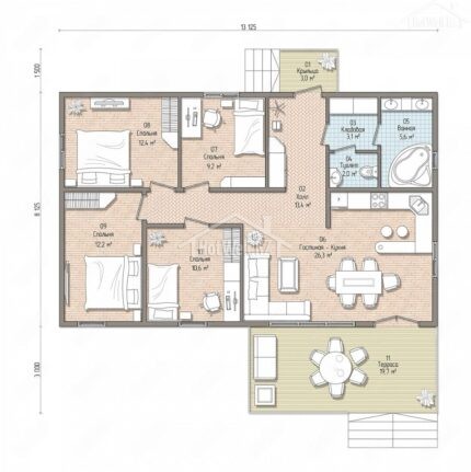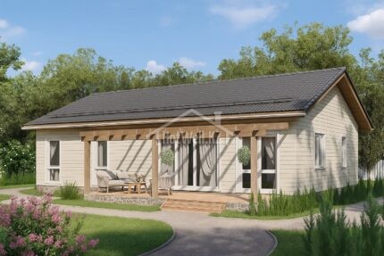 Одноэтажный дом 18 на 9 метров, общей площадью 155 м2, из СИП панелей, с бойлерной, террасой и спальней на первом этаже.