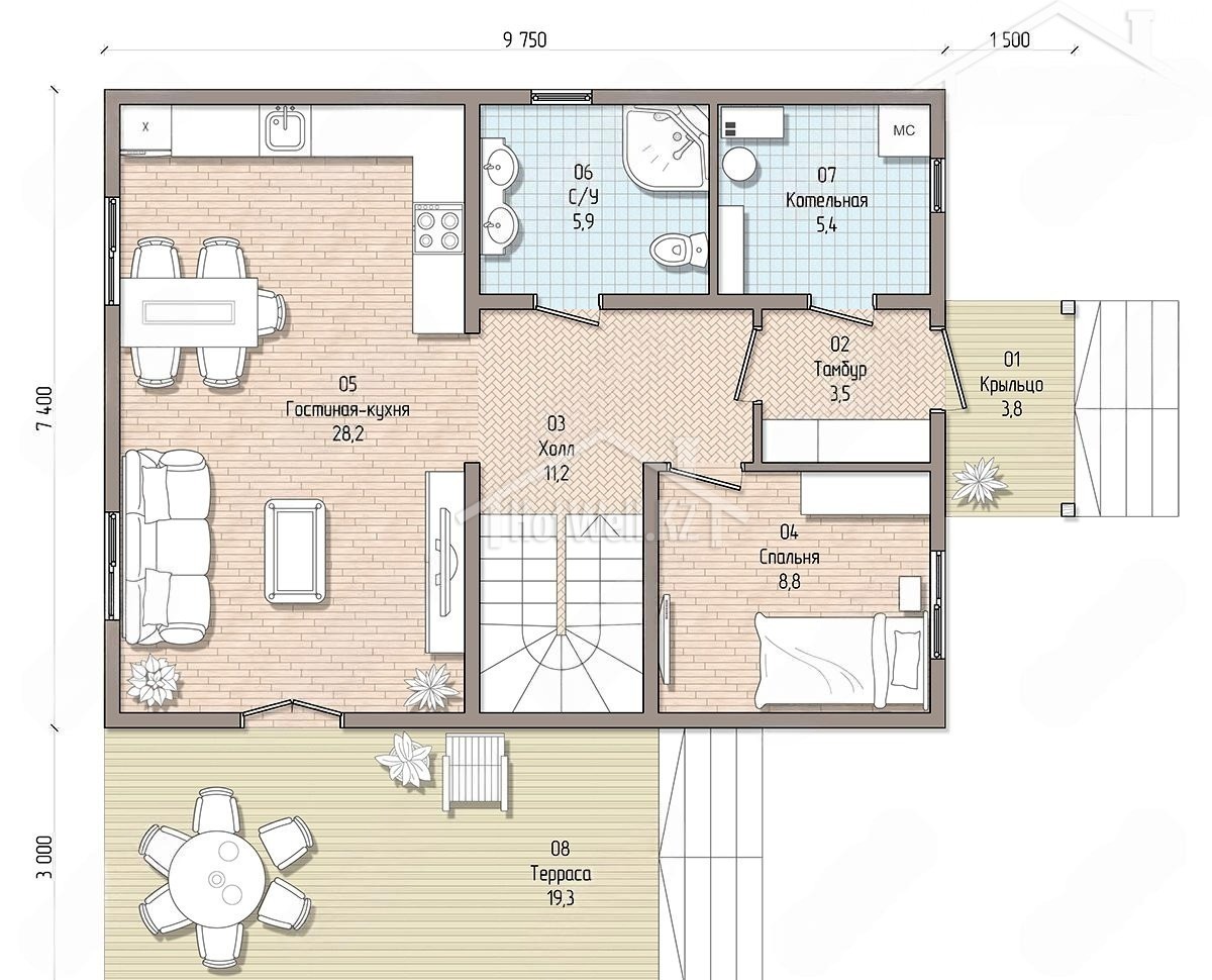 Двухэтажный дом 11 на 10 метров, общей площадью 168 м2, из СИП панелей, с бойлерной, террасой и спальней на первом этаже.