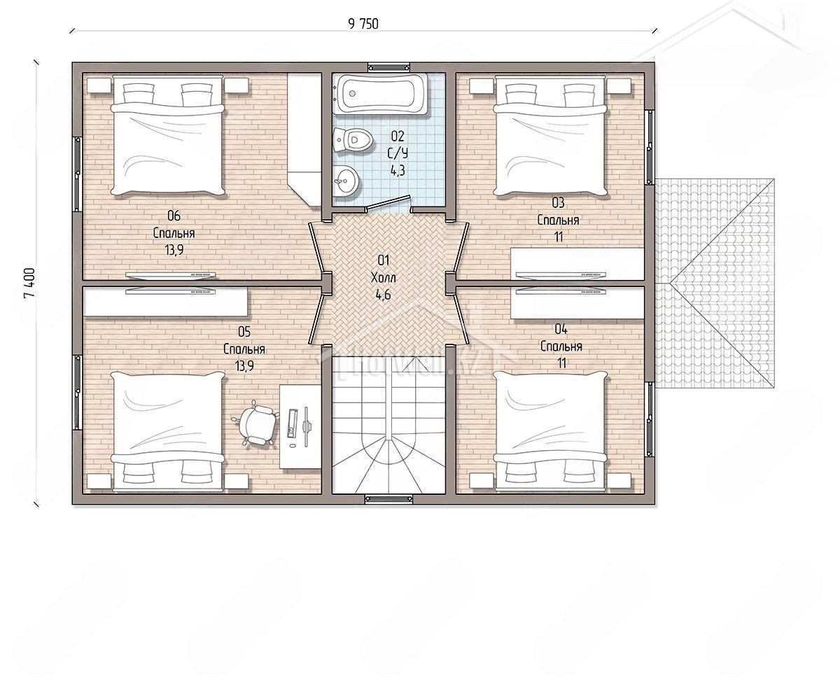 Данный проект дома основан на основе популярного проекта А-100, разница в том что у данного проекта вынесено за пределы дома тех помещение с тамбуром. Проект имеет большую гостинную на первом этаже 22 м2, отдельную кухню. Второй этаж имеет три спальни и сан узел. Тип крыши двускатная. Очень хороший и популярный проект.