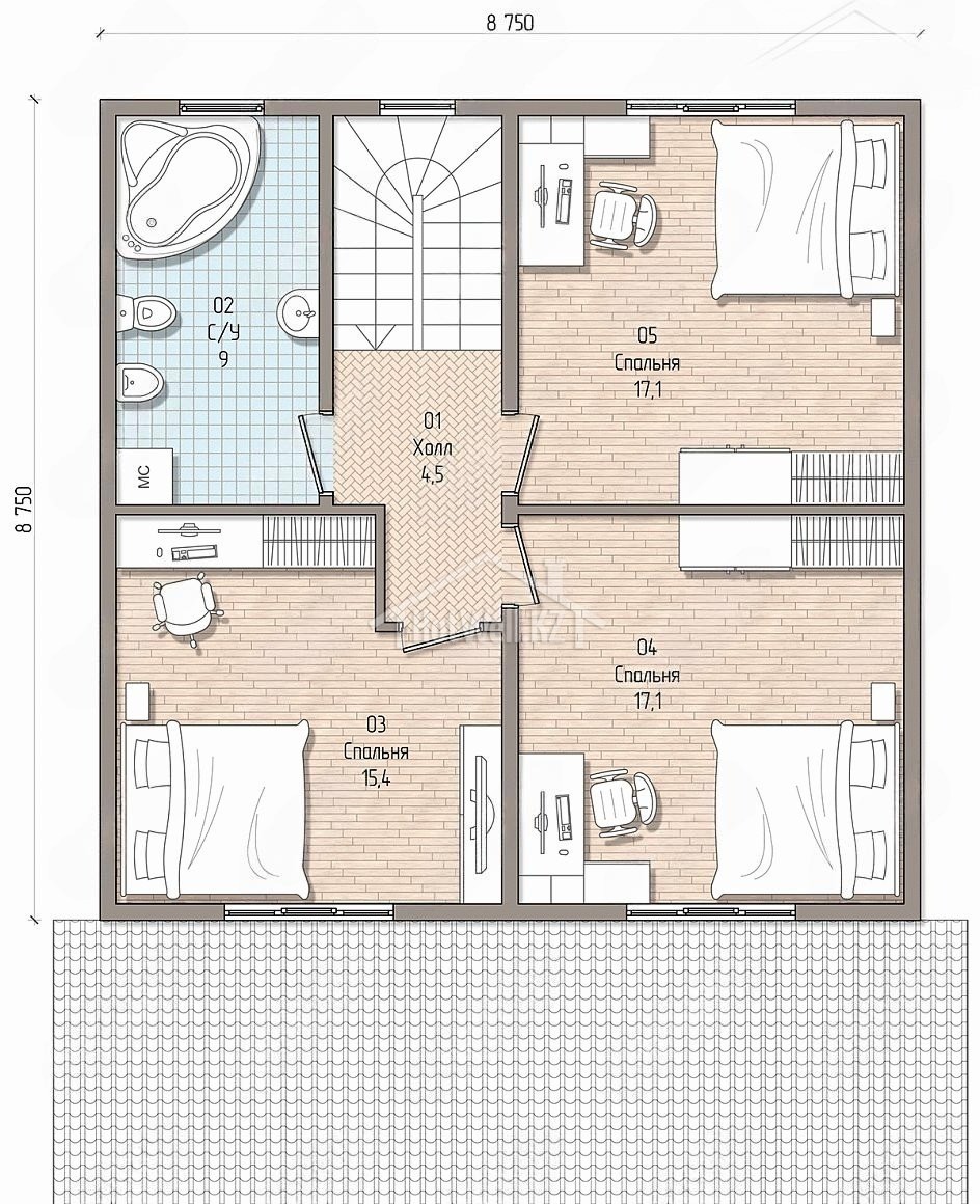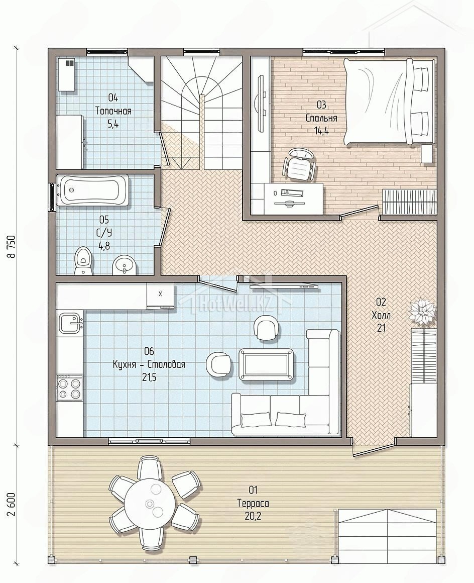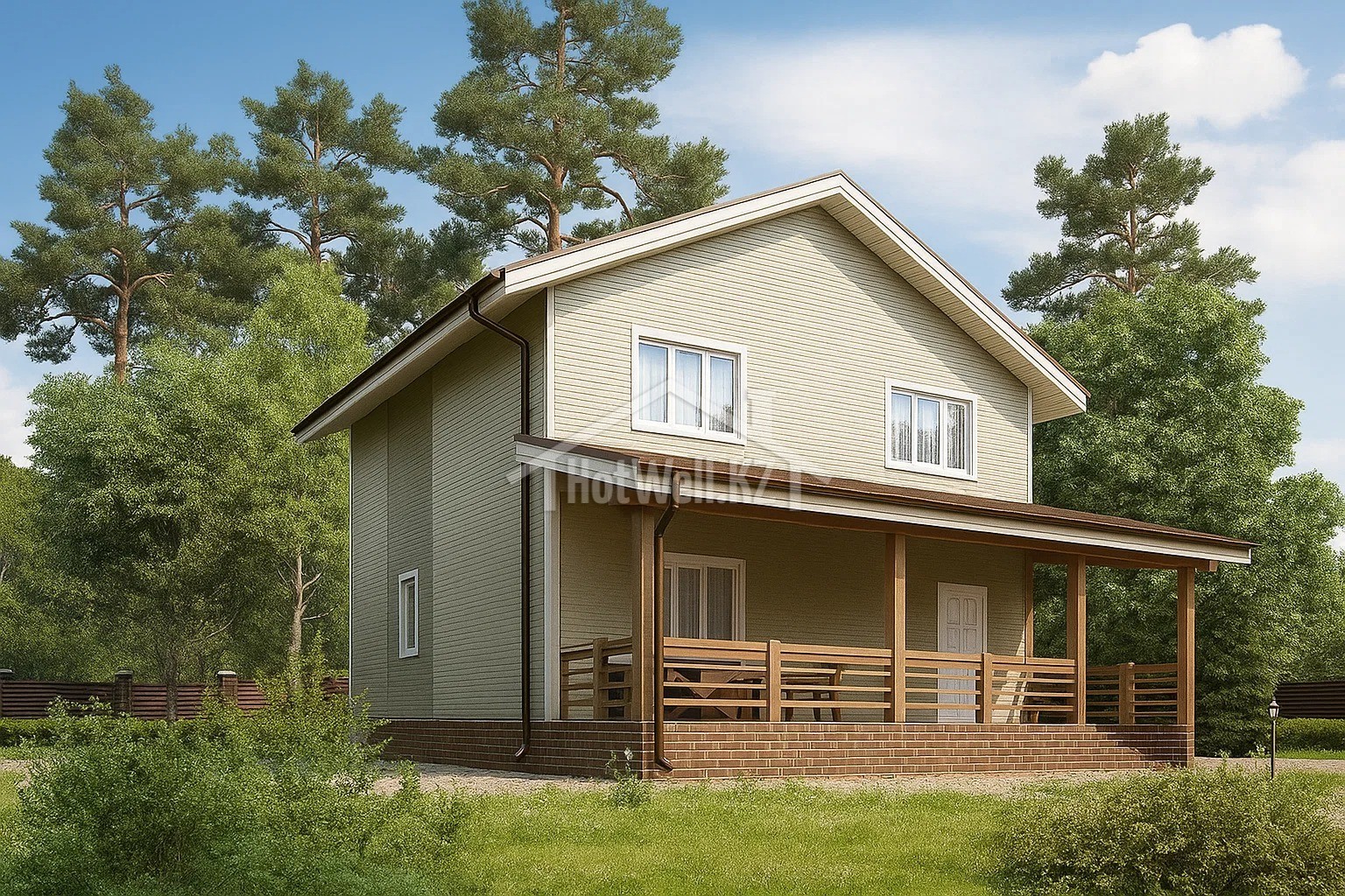 Данный проект дома основан на основе популярного проекта А-100, разница в том что у данного проекта вынесено за пределы дома тех помещение с тамбуром. Проект имеет большую гостинную на первом этаже 22 м2, отдельную кухню. Второй этаж имеет три спальни и сан узел. Тип крыши двускатная. Очень хороший и популярный проект.