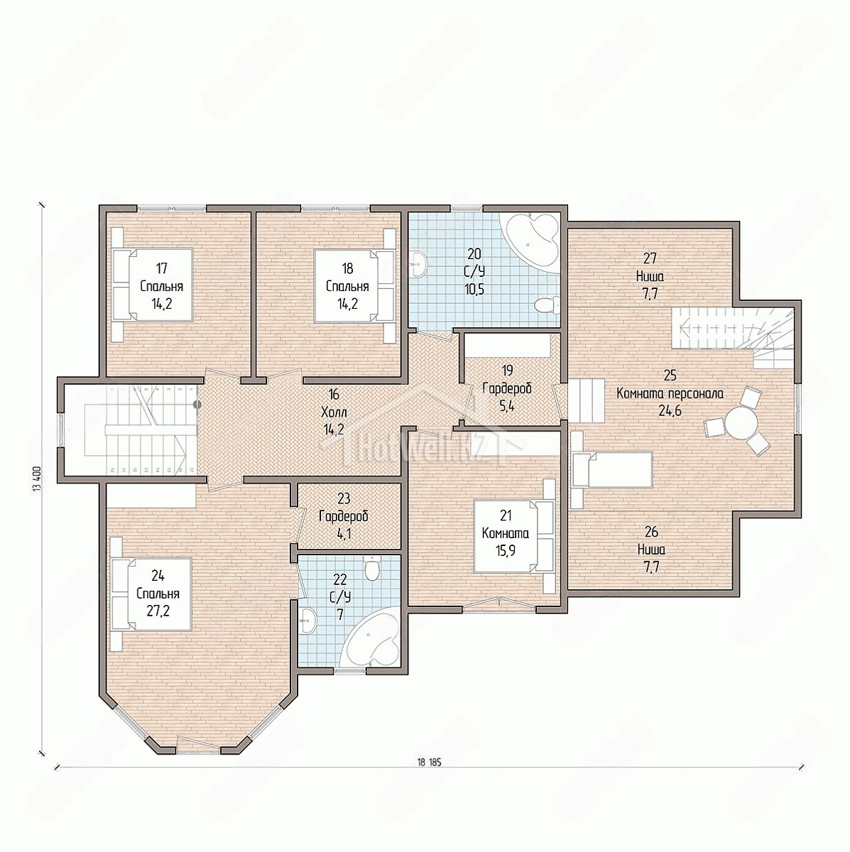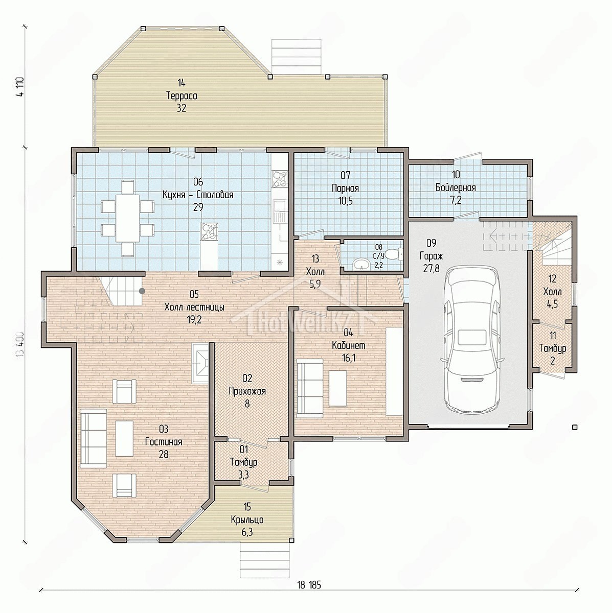 Двухэтажный дом 18 на 18 метров, общей площадью 403 м2, из СИП панелей, с сауной, бойлерной, гаражом, террасой, эркером и спальней на первом этаже.