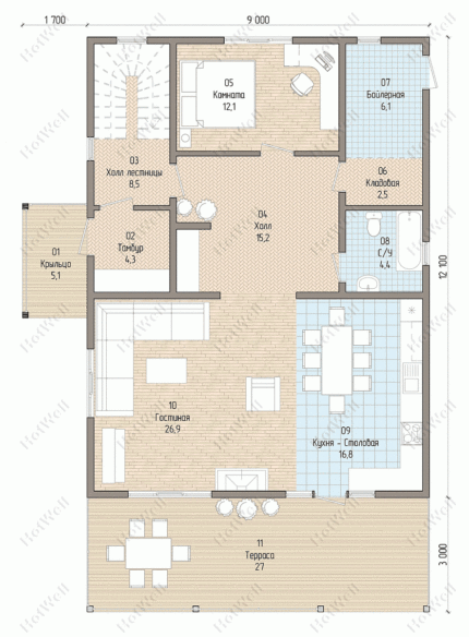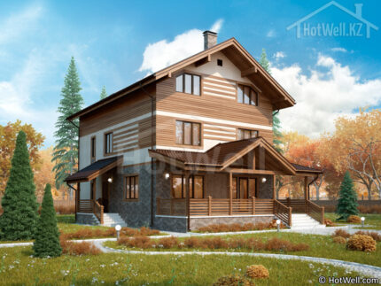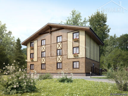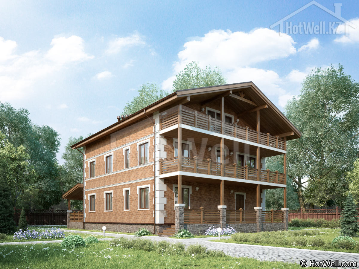 Трехэтажный дом 18 на 11 метров, общей площадью 502 м2, из СИП панелей, с террасой, балконом и спальней на первом этаже.